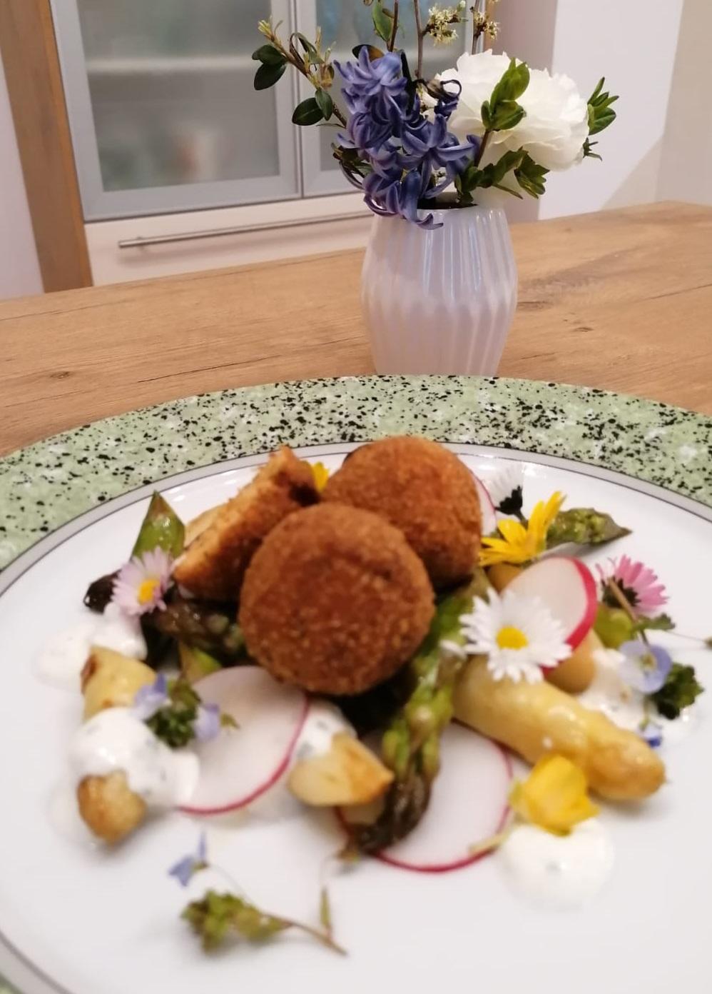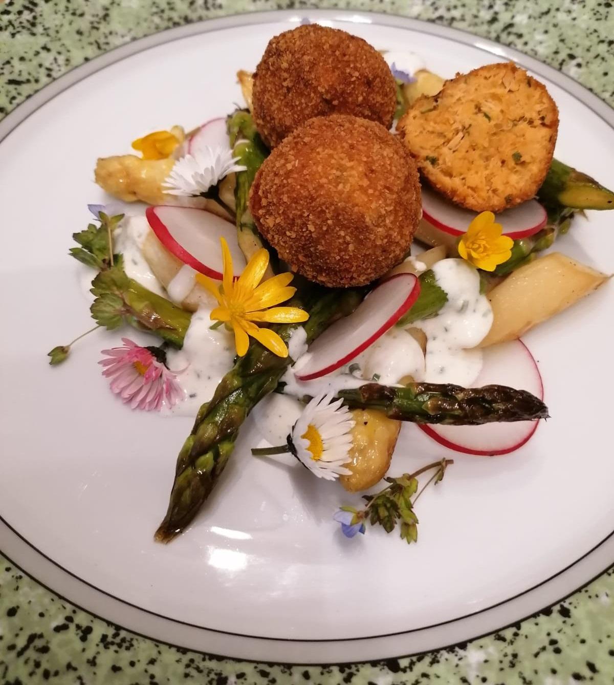 | Schritt 6: | Den vorbereiteten Sauerrahm auf dem warmen Spargel verteilen, die warmen Lachs-Pralinen daraufsetzen und mit Blüten, Kräutern und den gehobelten Radieschen garnieren. |