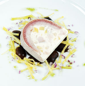 Serviervorschlag: Matjes-Terrine auf Käferbohnensalat, roter Zwiebelvinaigrette und Mini-Frites
