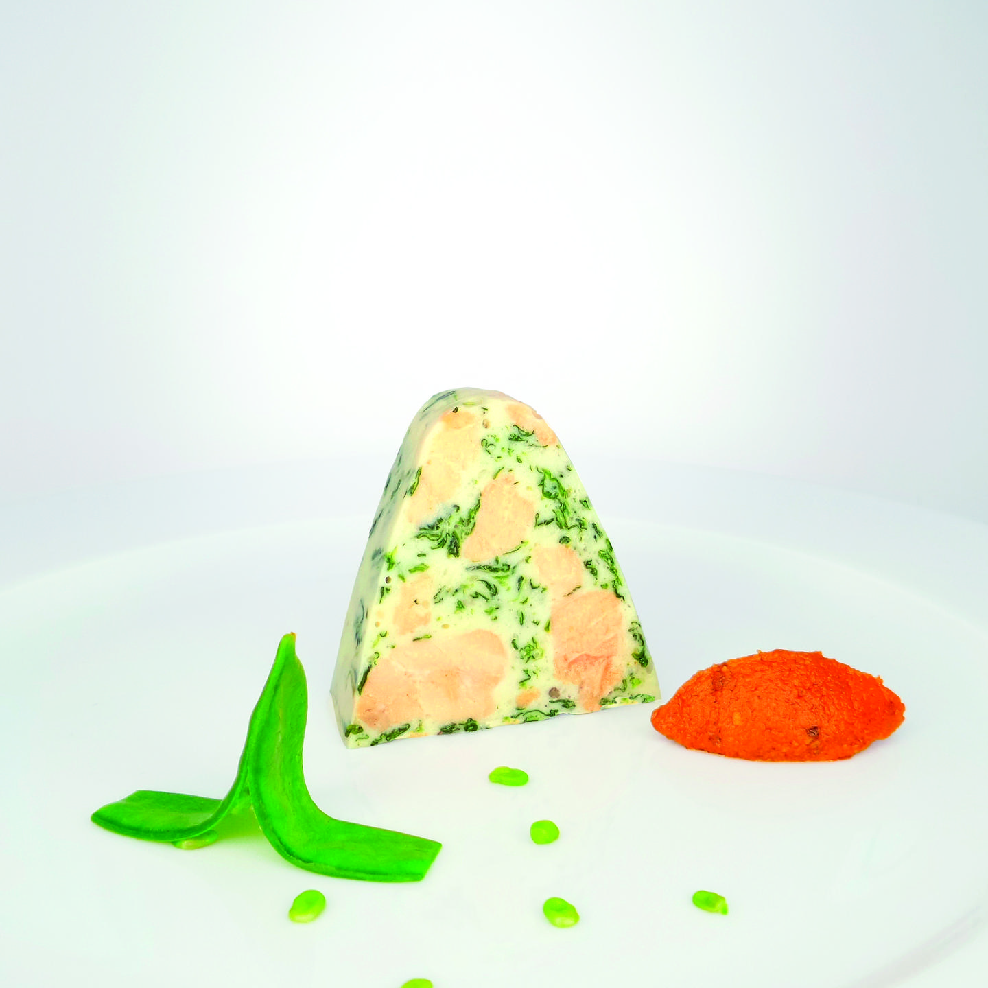 Feine Kombination aus frischem Lachs zart pochiert und aromatischen Räucherlachsmousse, getoppt von einem Dill-Gelee