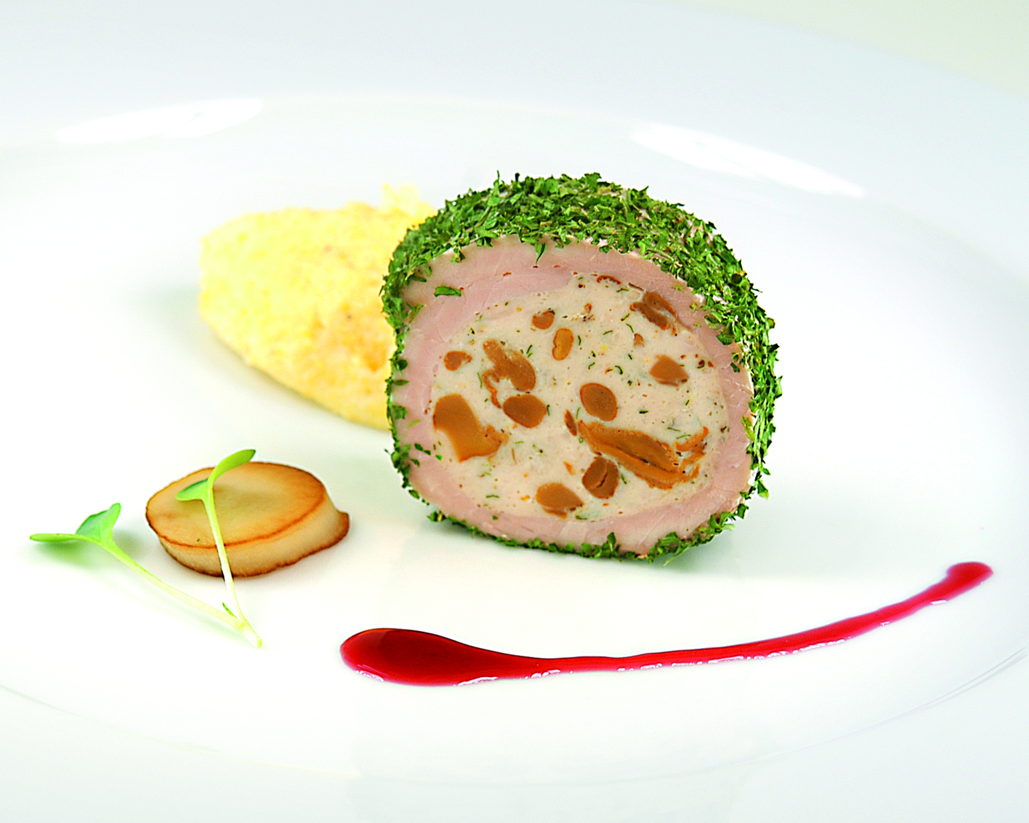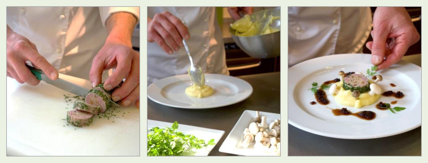 Serviervorschlag 1: Lauwarm serviert auf Kürbiskern-Vinaigrette und frischem Kren
