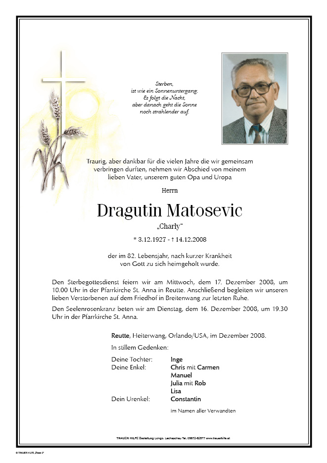 13.12.1901 14.12.2008 Reutte "Dragutin ""Charly""" Matosevic Action Parte Gedenkkerzen Kondolenzen Parte Gedenkkerzen Kondolenzen Parte herunterladen Gedenkkerzen für "Dragutin ""Charly""" Matosevic 0 Einträge Kerze anzünden Ihre Gedenkkerze für"Dragutin ""Charly""" Matosevic Ihr Name* Farbe auswählen Ihre Nachricht oder Name* E-Mail-Adresse* Mit dem Klicken auf "Kerze anzünden" erklären Sie sich mit unseren Datenschutzbestimmungen einverstanden. Kondolenzbuch für "Dragutin ""Charly""" Matosevic 0 Einträge Kondolenz verfassen Ihr Abschiedsgruß an "Dragutin ""Charly""" Matosevic Ihr Name* E-Mail-Adresse* Ihre Nachricht* Mit dem Klicken auf "Gruß absenden" erklären Sie sich mit unseren Datenschutzbestimmungen einverstanden.