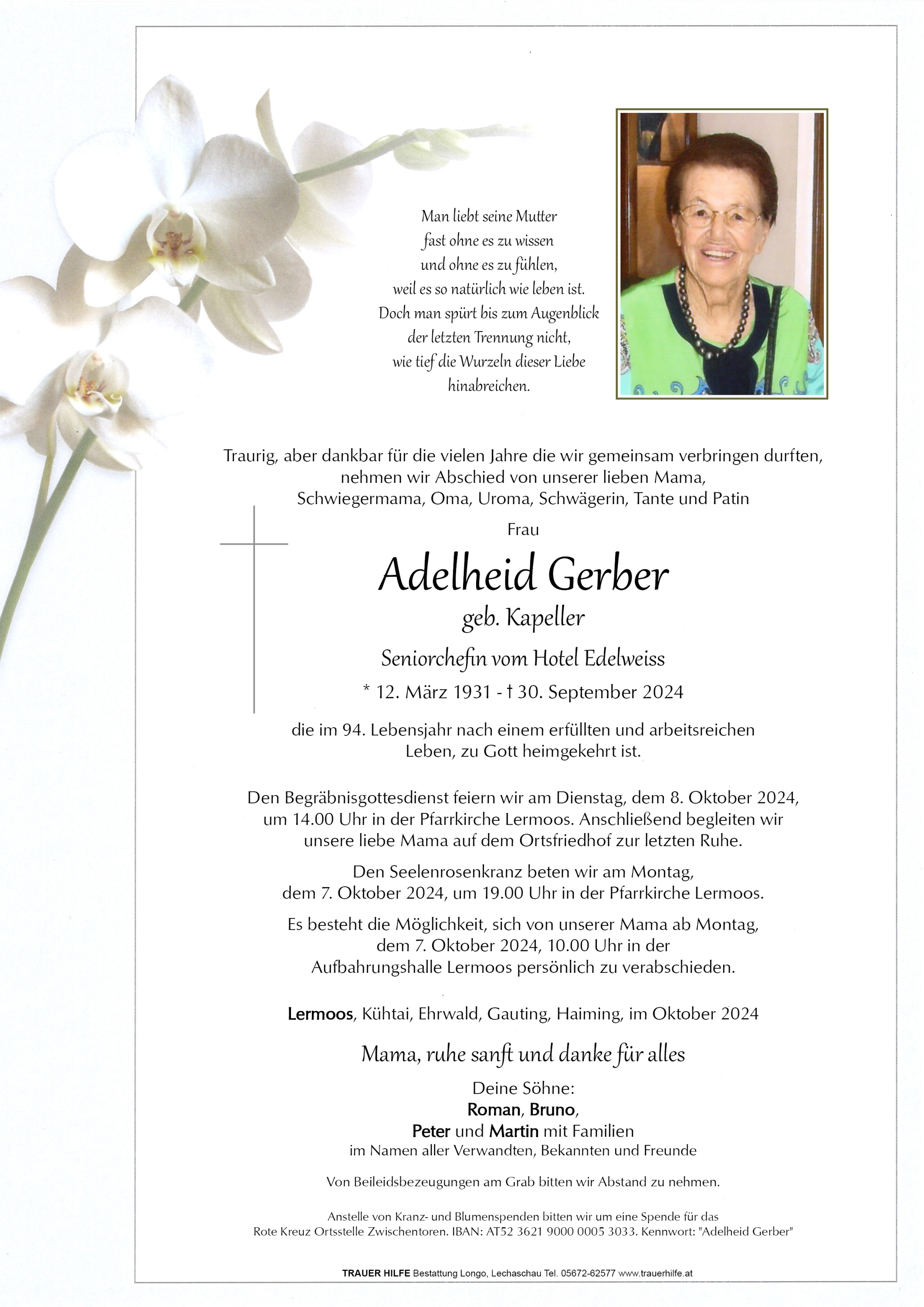 Nach einem erfüllten Leben, durfte Adi ihre letzte Reise antreten. Gerne denken wir an die lustigen Seniorenbusreisen mit Adi zurück. Wir werden sie in lieber Erinnerung behalten. Euch wünschen wir viel Kraft. In Gedanken sind wir bei euch Gerlinde und Hansi