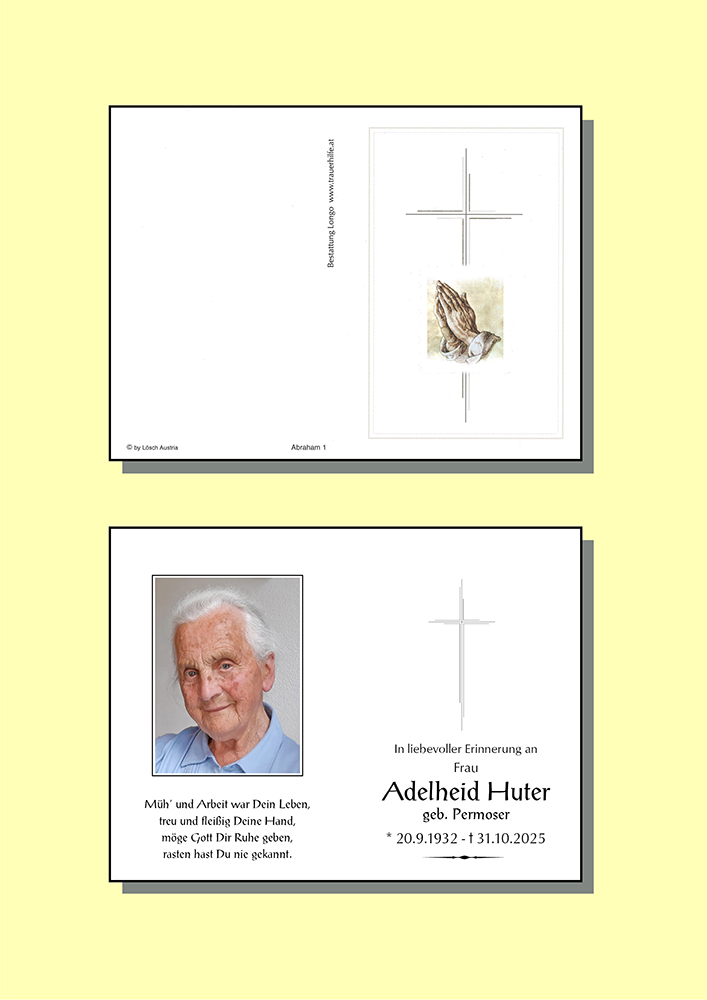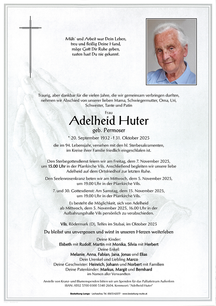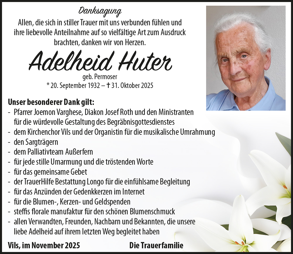 20.09.1932 31.10.2025 Vils Adelheid Huter Action Parte Sterbebild Gedenkkerzen Kondolenzen Danksagung Parte Sterbebild Gedenkkerzen Kondolenzen Danksagung Parte herunterladen Sterbebild herunterladen Gedenkkerzen für Adelheid Huter 176 Einträge Kerze anzünden In stillem Gedenken Ruhe in Frieden In stillem Gedenken Ein letzter Gruß! Ulli und Dietmar Hosp In stillem Gedenken - Moni Singer Marion Lederbauer Ulrike & Franz Ruhe in Frieden Renate mit Familie Ruhe in Frieden Oliver Schuler Ruhe in Frieden In stillem Gedenken Katrin Triendl Burgi Hammerle Herzliches Beileid - Simone Haug Martin Permoser Physiotherapie Carina Petz In stillem Gedenken Ruhe in Frieden Hab,s fein im?Himmel Rita Gruber Renate und Peter Petz Georg Drexel Andrea Winkler m. Familie Fam. Beatrix Monitzer Kornelia & Gerhard Hohenrainer Evi und Hubert Überegger Franziska Lorenz Christina & Stefan Familie Benjamin und Sandra (Köchl) Egger Fam. Christine & Matthias Bader Herzliche Anteilnahme, Elfriede Traxler Verena & Christian mit Fabian Kammerlander Ruhe in Frieden Fam. Mario und Marion Fasser Helga Schnitzlbaumer u. Edi Hosp Martha Familie Doris Wiedemann Doris Wex Koni Mischinger Anna Nightingale Julia und Jakob mit Lea Fam. Irmgard & Matthias Rief Amelie Vogler Hab\'s fein im Himmel ? Ruhe in Frieden Georg und Monika Vogler Familie Eva und Hermann Dobler Flo Fam. Kastner René Fam Giambalvo Notburga und Johann Obristhofer Uschi Petz Rita & Alfred Vogler Gerti u. Bernd Walk Ruhe in Frieden Ruhe in Frieden Edith Mitterer ??️ Fam.Reis Simona und Ernst Schretter Andrea Abraham Das ewige Licht leuchte dir! Fam. Lochbihler Ein Licht aus Höfen Anita Ostheimer Christina Beirer Andrea u. Frank Harnos Ute Stebele Conny Carmen Settele mit Familie Familie Eckert Fam. Rudi & Erika Petz Claudia Klaunzer Gerda Schlichther Familie Anton Specht Michael und Renate Moore Ein Licht aus Höfen Karl und Ingrid Mages Fam.Fritz &Ursula Geyeregger Tanja Fam.Permoser Markus und Marlies Hanni & Franz Kögl Renate Horch Ein letzter Gruß! Ulli und Dietmar Hosp Ruhe in Frieden HERTA Fam. Andreas Petz Simone & Berni mit Julius, Alina u. Elias Evi,Robert, Nadja und Raphael Fam. Dalibor und Martina Skrbic Heidi m. Familie Marianne Jäger Ruhe in Frieden Monika und Julius Mario und.Barbara Rief Markus und Sissi Erd Marco Familie Max und Karin Mellauner Mario Ruhe in Frieden Conny und Pius mit Familie Anni Hummel Verena Mayer-Rief Lisl Tröber In stillem Gedenken - Moni Singer Elisabeth und Hansjörg Tröber mit Fam. Anita und Helmut Frick Fam. Andi u. Sabine Hosp Christiane mit Familie Markus Meier ? Elisabeth Singer Stebele Agathe Fam. Birgit und Ulli Premm Für Elsbeth von Sarah ? Karin Schretter Ruhe in Frieden ✨?️ Michaela Moll Walter u Bettina Ahorn Markus und Claudia Monitzer Fam. Huter Rudolf und Elfriede RIF Klaudia Schmid (Haas) Ilse u. Armin Erd Sandra mit Familie Familie Mathias & Andrea Huter Martin & Simone Petz Fam. Sonja und Günther Köchl ?️ Cvijeta Neuner Martin und Heike Gassmann In stillem Gedenken OSR Richard Wasle Dominik Heiserer Nadja und Stefan Arthur hosp Fam. Otto Permoser Marlene & Ernst Ruhe in Frieden, Petra G. Daniela Lehmann Karin Babl Gerlinde Haunsberger Ingrid Sonnweber Evi Keller Edith & Peter Leitgeb Hedi Annelies und Klaus Singer Elfriede Huber Ruhe in Frieden Ingrid und Gebhard Ernst u. Angelika Permoser Fam. Paul Kaiser Margit & Lukas Permoser Carmen Kuen Herzliches Beileid Ingrid und Adi Beirer Wolfgang, Irene und Anna Litter Mellauner Matthias Fam. Astrid und Bernhard Brugger Lena und Thomas Palliativteam Außerfern Monika Norbert philipp Schretter Walter Ruhe in Frieden Christl aus Suedafrika Fam. Franz Lochbihler Inge Wörle Melitta Ginther Ruhe in Frieden Helmut und Elsmarie Annelies und Gerhard Steurer Katharina Rumpf Heidi und Helmut Elsa und Willi Kaiser Fam. Josef Permoser Fam.Bernhard Strigl? Erika Lewisch mit Fam. Pfiat di letzte Grüsse Ingrid Fam. Kurt und Marlene Lachmair Charly Winkler Toni Berger mit Margit und Florian Fam. Joachim u. Uschi Petz Carmen Strigl-Petz mit Familie Rudolf Sonja ,walk Manfred und Mina Herzliche Anteilnahme Mair Erika Martha Mörz ( Erd) Kempten Claudia Schreieck TrauerHilfe Bestattung Longo Ihre Gedenkkerze fürAdelheid Huter Ihr Name* Farbe auswählen Ihre Nachricht oder Name* E-Mail-Adresse* Mit dem Klicken auf "Kerze anzünden" erklären Sie sich mit unseren Datenschutzbestimmungen einverstanden. Kondolenzbuch für Adelheid Huter 0 Einträge Kondolenz verfassen Ihr Abschiedsgruß an Adelheid Huter Ihr Name* E-Mail-Adresse* Ihre Nachricht* Mit dem Klicken auf "Gruß absenden" erklären Sie sich mit unseren Datenschutzbestimmungen einverstanden. Danksagung herunterladen