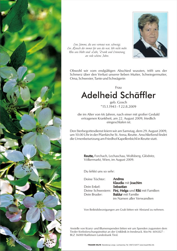 13.12.1901 22.08.2009 Reutte Adelheid Schäffler Action Parte Gedenkkerzen Kondolenzen Parte Gedenkkerzen Kondolenzen Parte herunterladen Gedenkkerzen für Adelheid Schäffler 47 Einträge Kerze anzünden A Liachtle für di ! Zum Geburtstag !! Sabine A Liachtle für di zum Geburtstag !! Andrea Andrea und Sabine Klaudia, Joachim und Sebastian Andrea und Sabine Wir denken an dich! Klaudia, Joachim & Sebastian Klaudia & Joachim Andrea + Sabine Andrea Andrea Für dich! Wir vermissen dich! Wir denken an dich! In lieber Erinnerung Wir vermissen dich! Sabine Andrea In Gedanken bei dir! In Gedanken bei dir! Wir denken an dich! Andrea Sabine sabine andrea Wir denken an dich! Sabine Andrea Wir vermissen dich! Wir denken an dich! Du fehlst! Unvergessen Wir vermissen dich! Wir denken an dich Sabine Ein Licht für dich Andrea Ein Licht für dich! Für dich, Mama! Wir denken an dich Klaudia, Joachim und Sebastian Sabine Andrea Sabine Andrea Klaudia Ihre Gedenkkerze fürAdelheid Schäffler Ihr Name* Farbe auswählen Ihre Nachricht oder Name* E-Mail-Adresse* Mit dem Klicken auf "Kerze anzünden" erklären Sie sich mit unseren Datenschutzbestimmungen einverstanden. Kondolenzbuch für Adelheid Schäffler 1 Eintrag Kondolenz verfassen Ewig ist die Fortschreitung zur Vollkommenheit, obgleich am Grabe die Spur vor dem Auge verschwindet. Sebastian 23.09.2012 um 09:23 Uhr Ihr Abschiedsgruß an Adelheid Schäffler Ihr Name* E-Mail-Adresse* Ihre Nachricht* Mit dem Klicken auf "Gruß absenden" erklären Sie sich mit unseren Datenschutzbestimmungen einverstanden.