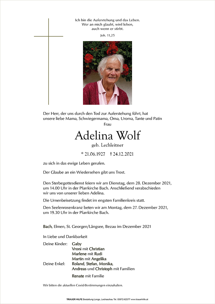Es war eine wertvolle Zeit mit dir Base ,die ich das halbe Jahr mit der Pflege von dir erlebt habe,für alles Vergelts Gott was du uns allen getan hast und für alle da warst es trauern um dich ,wenn wi r auch dir die ewige Ruhe gönnen wenn du jetzt bei deinen Lieben bist. Margit mit Kinder