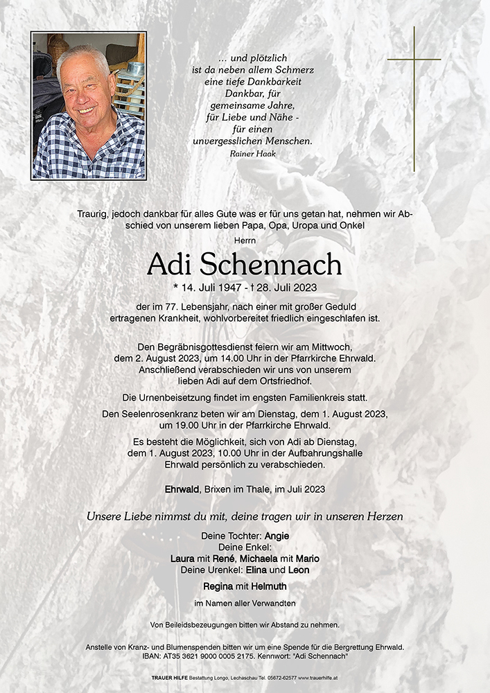 Mir saga zum Abschied leise Pfiat Di und denka an den netta Huagarta ba dir in da Stuba. Wia ma Bildla a‘gschaugt haba, wia ba da Bergrettung warsch und vu die kluana Enkel und Urenkel, auf dia du so stolz warsch.