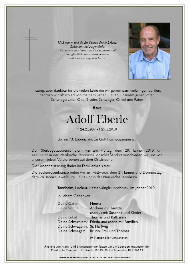 13.12.1901 27.01.2010 Tannheim Adolf Eberle Action Parte Sterbebild Gedenkkerzen Kondolenzen Danksagung Parte Sterbebild Gedenkkerzen Kondolenzen Danksagung Parte herunterladen Sterbebild herunterladen Gedenkkerzen für Adolf Eberle 3 Einträge Kerze anzünden das Ewige Licht leuchte dir Ein Licht für dich Siegfried RUHE IN FRIEDEN ADOLF Ihre Gedenkkerze fürAdolf Eberle Ihr Name* Farbe auswählen Ihre Nachricht oder Name* E-Mail-Adresse* Mit dem Klicken auf "Kerze anzünden" erklären Sie sich mit unseren Datenschutzbestimmungen einverstanden. Kondolenzbuch für Adolf Eberle 0 Einträge Kondolenz verfassen Ihr Abschiedsgruß an Adolf Eberle Ihr Name* E-Mail-Adresse* Ihre Nachricht* Mit dem Klicken auf "Gruß absenden" erklären Sie sich mit unseren Datenschutzbestimmungen einverstanden. Danksagung herunterladen