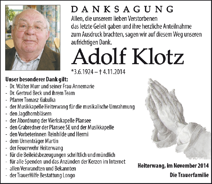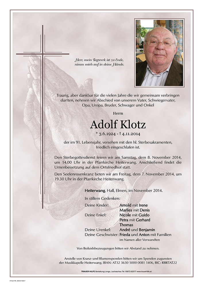 mein herzliches Beileid wünscht Euch Birgit Strasser (Wechner)... Ich werde Adolf in lieber Erinnerung behalten als meinen Lehrer bei den Außerferner Jagdhornbläsern, er war eine gute Seele!