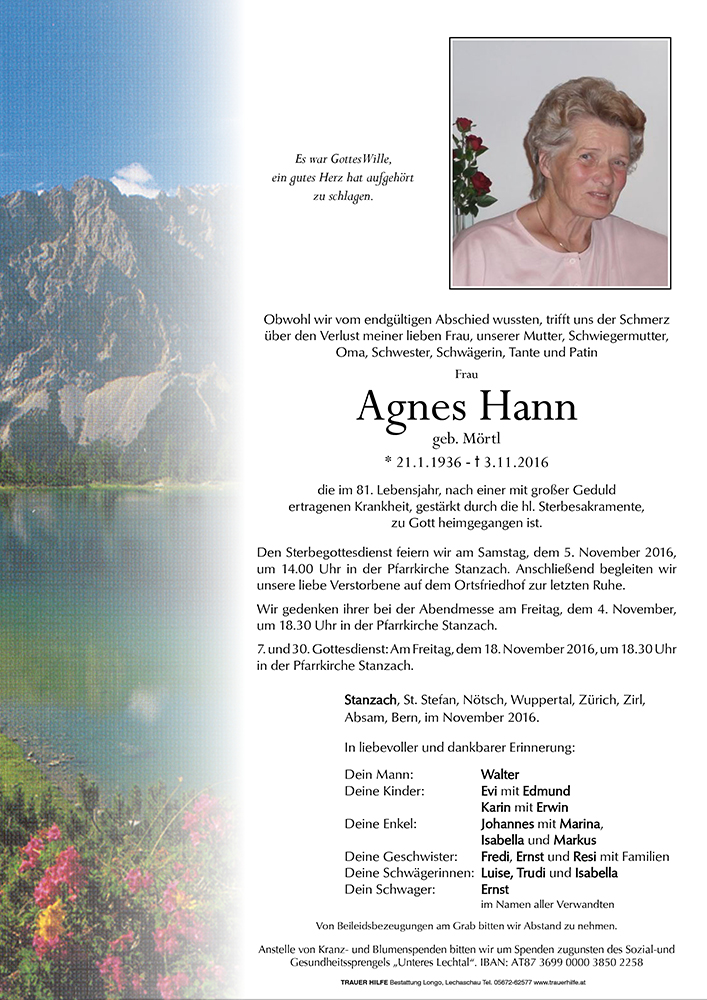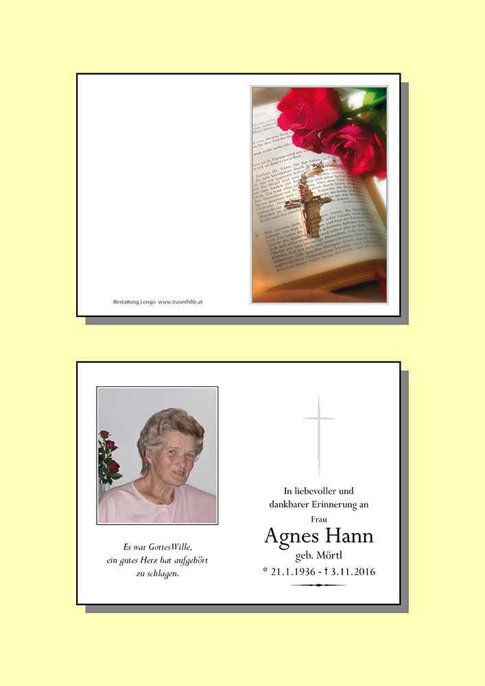 Wissen, dass ich Dich nie mehr sehen oder fühlen kann, ist unfassbar. Bin ich froh, dass wir in Juli und in August Dich noch sehen und sprechen haben können! Das lezte Bild, das ich von Dir habe, ist Dein Zeigefinger, womit Du sagen wolltest, dass ich unbedingt anhalten muss wenn ich den folgenden Tag wieder nach Belgien fuhr. \\\'Jaja, ich komme sicher, Agnes!\\\' Und wie froh bin ich, dass ich in August noch habe sagen können, dass ich Dich liebe! Agnes, Gestern, am Samstag, den 5. November, war ich zufällig ganz alleine auf dem Friedhof und ich sah, dass die Türen geöffnet waren. Agnes, Du warst da!! Du und ich alleine. Es hat so sien müssen. Du hast so viel bedeutet für mich. Ich werde Dich NIE vergessen!!