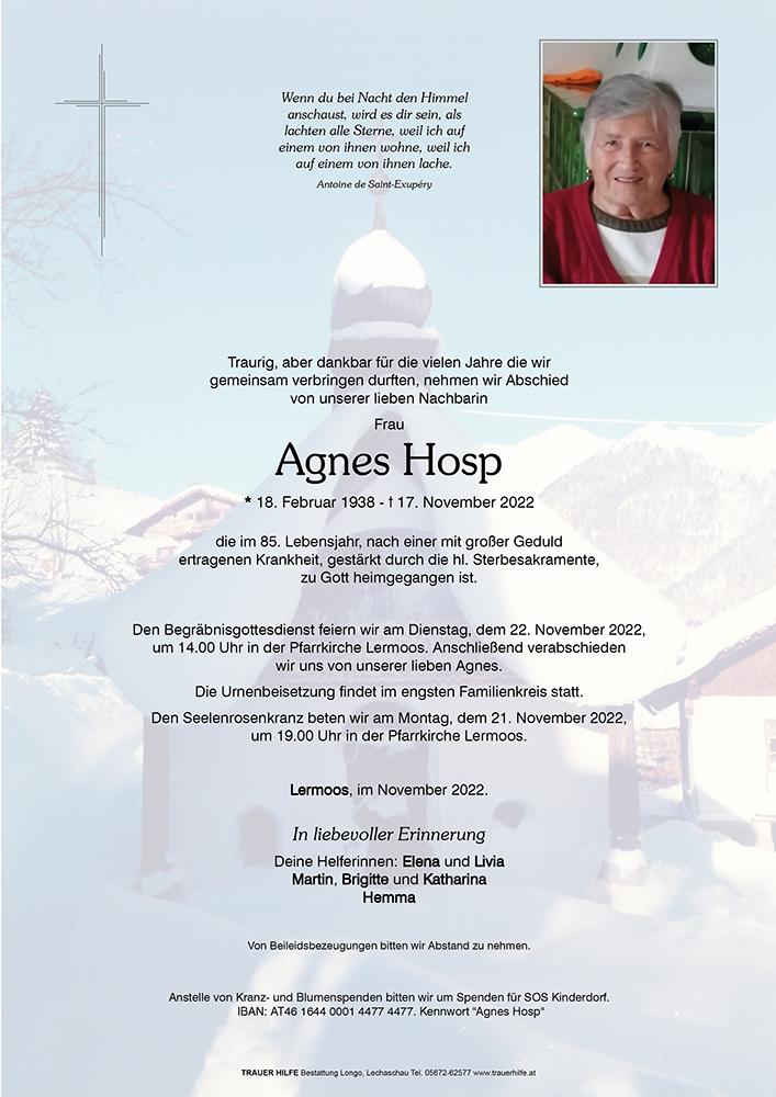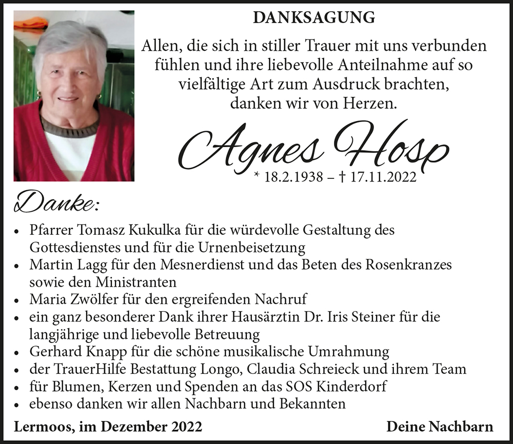 Agnes, danke, dass wir Dich kennenlernen und lieben lernen durften. Grüß\' Willi und vergiss\' uns nicht.