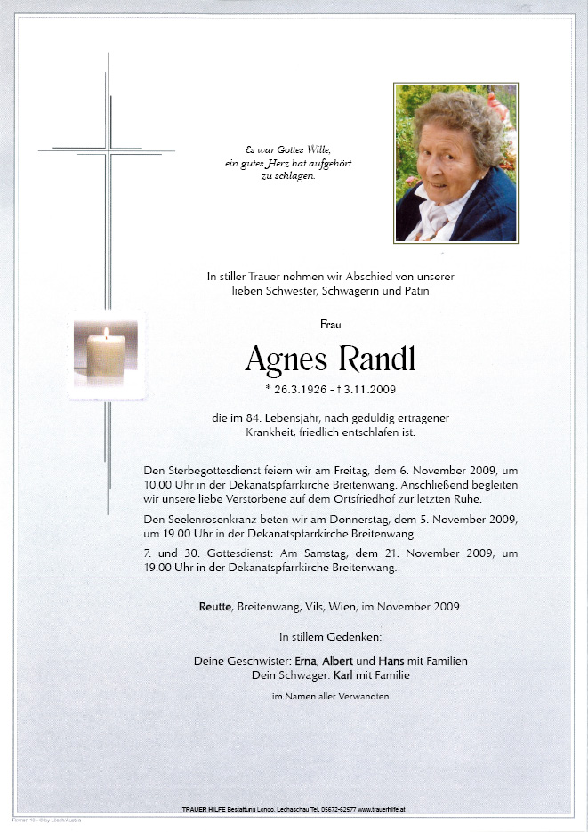 13.12.1901 03.11.2009 Reutte Agnes Randl Action Parte Gedenkkerzen Kondolenzen Parte Gedenkkerzen Kondolenzen Parte herunterladen Gedenkkerzen für Agnes Randl 10 Einträge Kerze anzünden werde dich nie vergessen Erich Wolf Erich Wolf In Erinnerung, zum Geburtstag! Ich denk an dich! Erich Wolf ***für dich*** ***danke*** ***Ich denke an dich*** in gedanken bei uns nadja Ihre Gedenkkerze fürAgnes Randl Ihr Name* Farbe auswählen Ihre Nachricht oder Name* E-Mail-Adresse* Mit dem Klicken auf "Kerze anzünden" erklären Sie sich mit unseren Datenschutzbestimmungen einverstanden. Kondolenzbuch für Agnes Randl 0 Einträge Kondolenz verfassen Ihr Abschiedsgruß an Agnes Randl Ihr Name* E-Mail-Adresse* Ihre Nachricht* Mit dem Klicken auf "Gruß absenden" erklären Sie sich mit unseren Datenschutzbestimmungen einverstanden.