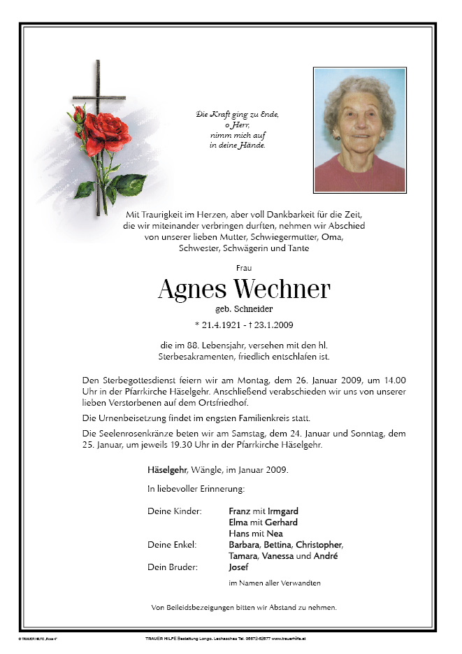 13.12.1901 23.01.2009 Häselgehr Agnes Wechner Action Parte Gedenkkerzen Kondolenzen Parte Gedenkkerzen Kondolenzen Parte herunterladen Gedenkkerzen für Agnes Wechner 10 Einträge Kerze anzünden zum 7. Jahrtag liebe Oma Seniorenbund Häselgehr Frohe Weihnachten für dich ein Gruß an dich zum Jahrtag zum 5. Jahrtag von Bettina Frohe Weihnachten liebe Oma für Oma und Uroma Oma, ich denk an Dich Ihre Gedenkkerze fürAgnes Wechner Ihr Name* Farbe auswählen Ihre Nachricht oder Name* E-Mail-Adresse* Mit dem Klicken auf "Kerze anzünden" erklären Sie sich mit unseren Datenschutzbestimmungen einverstanden. Kondolenzbuch für Agnes Wechner 0 Einträge Kondolenz verfassen Ihr Abschiedsgruß an Agnes Wechner Ihr Name* E-Mail-Adresse* Ihre Nachricht* Mit dem Klicken auf "Gruß absenden" erklären Sie sich mit unseren Datenschutzbestimmungen einverstanden.