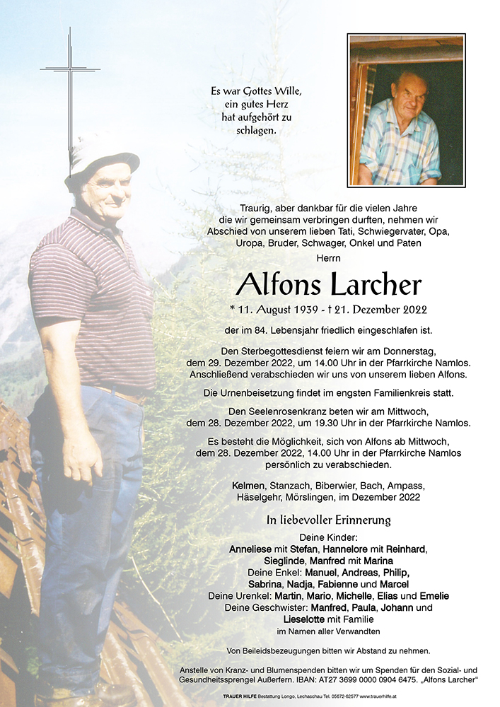 Liebe Sieglinde, lieber Marcel und die Trauerfamilien: kenne deinen Papa /Opa nur vom Erzaehlen, jedoch war er der Mittelpunkt der Familie. Herzliche Anteilnahme!