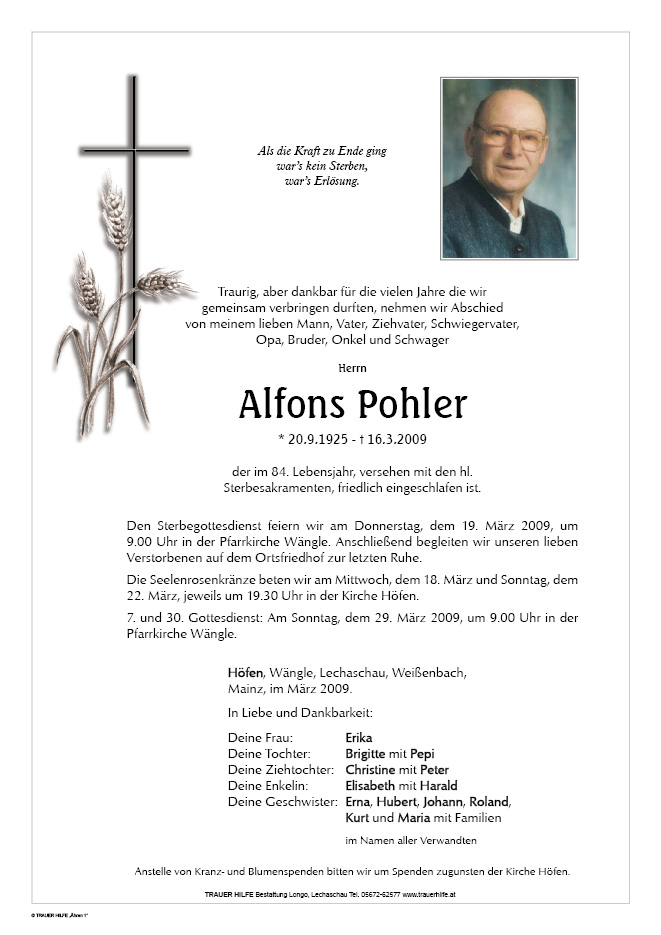 13.12.1901 16.03.2009 Höfen Alfons Pohler Action Parte Gedenkkerzen Kondolenzen Parte Gedenkkerzen Kondolenzen Parte herunterladen Gedenkkerzen für Alfons Pohler 0 Einträge Kerze anzünden Ihre Gedenkkerze fürAlfons Pohler Ihr Name* Farbe auswählen Ihre Nachricht oder Name* E-Mail-Adresse* Mit dem Klicken auf "Kerze anzünden" erklären Sie sich mit unseren Datenschutzbestimmungen einverstanden. Kondolenzbuch für Alfons Pohler 0 Einträge Kondolenz verfassen Ihr Abschiedsgruß an Alfons Pohler Ihr Name* E-Mail-Adresse* Ihre Nachricht* Mit dem Klicken auf "Gruß absenden" erklären Sie sich mit unseren Datenschutzbestimmungen einverstanden.