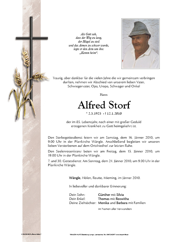 13.12.1901 12.01.2010 Wängle Alfred Storf Action Parte Gedenkkerzen Kondolenzen Parte Gedenkkerzen Kondolenzen Parte herunterladen Gedenkkerzen für Alfred Storf 0 Einträge Kerze anzünden Ihre Gedenkkerze fürAlfred Storf Ihr Name* Farbe auswählen Ihre Nachricht oder Name* E-Mail-Adresse* Mit dem Klicken auf "Kerze anzünden" erklären Sie sich mit unseren Datenschutzbestimmungen einverstanden. Kondolenzbuch für Alfred Storf 0 Einträge Kondolenz verfassen Ihr Abschiedsgruß an Alfred Storf Ihr Name* E-Mail-Adresse* Ihre Nachricht* Mit dem Klicken auf "Gruß absenden" erklären Sie sich mit unseren Datenschutzbestimmungen einverstanden.
