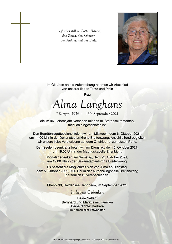 08.04.1926 30.09.2021 Ehenbichl Alma Langhans Action Parte Sterbebild Gedenkkerzen Kondolenzen Danksagung Parte Sterbebild Gedenkkerzen Kondolenzen Danksagung Parte herunterladen Sterbebild herunterladen Gedenkkerzen für Alma Langhans 98 Einträge Kerze anzünden Ruhe in Frieden Ruhe in Frieden Gedenken zum Jahrtag - Barbara Bernhard und Renate Berni Ruhe in Frieden! Gedenken zum Jahrtag - Barbara zum Jahresgedenken - Annemarie Gerber Markus Markus Ruhe in Frieden Alma, Klaudia Schmid Fam. Christl und Rudi Ginther Meier Markus Das ewige Licht leuchte dir! Ruhe in Frieden! Johannes Storf Ruhe in Frieden! Fam. Christl und Rudi Ginther Ruhe sanft! Frieda Mair ein herzliches Gedenken Annelies, Lisa, Sepp Paulweber Das ewige Licht leuchte dir! Wolfgang und Moni Reutte Ruhe in Frieden! Barbara u. Klaus Wechselberger Familie Brutscher Heinz Ursula mit Familie Ilse Nowak Fam. Salvenmoser Christoph Fam. Königsrainer Karlheinz u. Manuela Bernhard mit Familie Fam. Christoph Salvenmoser Familie Reinhard & Regina Eberle Ruhe in Frieden Fam. Stefan Beirer Günther & Alexandra Mair Familie Anton Specht Ilse und Richard Rizzoli Schweißgut Angela Maria Reinstadler mit Familie Willi und Hilanda Wolf Renate und Fridolin Reich Ruhe in Frieden! Fam. Irmgard Meier u. Markus Berni u. Lothar Reinstadler Birgit und Markus Rid mit Familie Hilanda und Willi Wolf Ein Licht begleitet dich Ruhe in Frieden Fam. Paul u. Veronika Kerber Martina Dablander Fam. Christl und Rudi Ginther Ruhe in Frieden Manuela u. Roland Hinterholzer Silvia Holzknecht Johannes Ginther Ernst & Uschi Brutscher Herbert u. Elisabeth Brutscher Berni Mairhofer In stillen Gedenken Fam. Gstir Ruhe sanft! Frieda Mair Ilse und Adalbert Rief Fam. KASTNER René Gertrud und Stefan Brüggll Annelies, Lisa, Sepp Paulweber Uschi leckner Willi u. Andrea Schädle Fam. Paul Meier Hanni Gruber mit Familie Birgit Hosp Fam. Bruno Reinstadler Isabella Wachter Gertrud und Maria Pohler Familie Oskar und Marlies Ginther Fam . Günther Haberl Doris Wex und Romana Ginther Paul Seitz mit Familie Edmunda Hosp Das ewige Licht leuchte dir! Julia Gruber Simone Gustl und Monika Ihrenberger Mario und. Barbara Rief ruhe in Frieden Fam. Paul und Annemarie Kaiser Fam. Eiter Hermann Familie Franz Ginther Ruhe in Frieden! Daniela Bentschitsch Haus Ehrenberg Wohnbereich 2 Ruhe in Frieden lb. Alma Marlen Schweiger Licht und Frieden - Annemarie Gerber Margarete u. Emmerich Lutz Siegi Grum und Eva Barbist Edi Ammann Wolfgang und Moni Reutte Claudia Schreieck TrauerHilfe Bestattung Longo Ihre Gedenkkerze fürAlma Langhans Ihr Name* Farbe auswählen Ihre Nachricht oder Name* E-Mail-Adresse* Mit dem Klicken auf "Kerze anzünden" erklären Sie sich mit unseren Datenschutzbestimmungen einverstanden. Kondolenzbuch für Alma Langhans 1 Eintrag Kondolenz verfassen Wir sind nur Gast auf Erden und wandern ohne Ruh‘ mit mancherlei Beschwerden der ewigen Heimat zu. Ruhe in Frieden 01.10.2021 um 13:36 Uhr Ihr Abschiedsgruß an Alma Langhans Ihr Name* E-Mail-Adresse* Ihre Nachricht* Mit dem Klicken auf "Gruß absenden" erklären Sie sich mit unseren Datenschutzbestimmungen einverstanden. Danksagung herunterladen