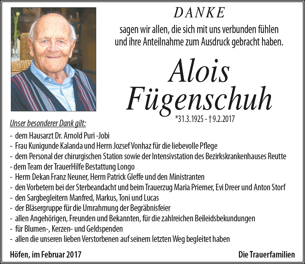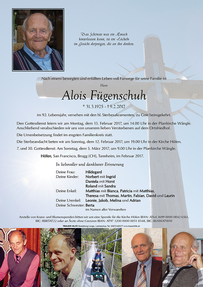 Er wird uns durch seinen bleibenden Platz in den Stammbäumen der Fügenschuh-Familien immer in Erinnerung sein.