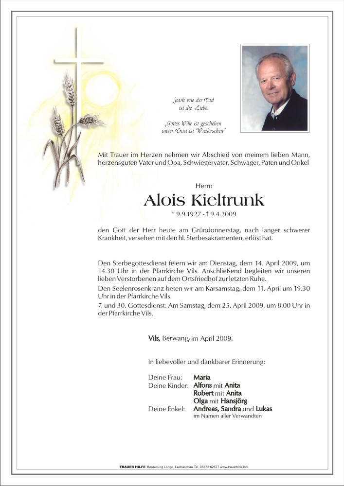 13.12.1901 09.04.2009 Vils Alois Kieltrunk Action Parte Gedenkkerzen Kondolenzen Parte Gedenkkerzen Kondolenzen Parte herunterladen Gedenkkerzen für Alois Kieltrunk 0 Einträge Kerze anzünden Ihre Gedenkkerze fürAlois Kieltrunk Ihr Name* Farbe auswählen Ihre Nachricht oder Name* E-Mail-Adresse* Mit dem Klicken auf "Kerze anzünden" erklären Sie sich mit unseren Datenschutzbestimmungen einverstanden. Kondolenzbuch für Alois Kieltrunk 0 Einträge Kondolenz verfassen Ihr Abschiedsgruß an Alois Kieltrunk Ihr Name* E-Mail-Adresse* Ihre Nachricht* Mit dem Klicken auf "Gruß absenden" erklären Sie sich mit unseren Datenschutzbestimmungen einverstanden.