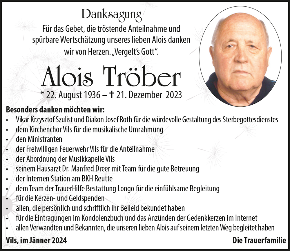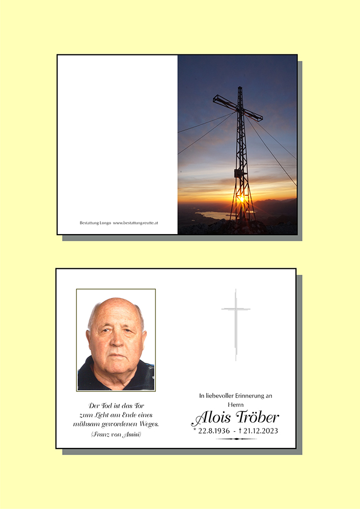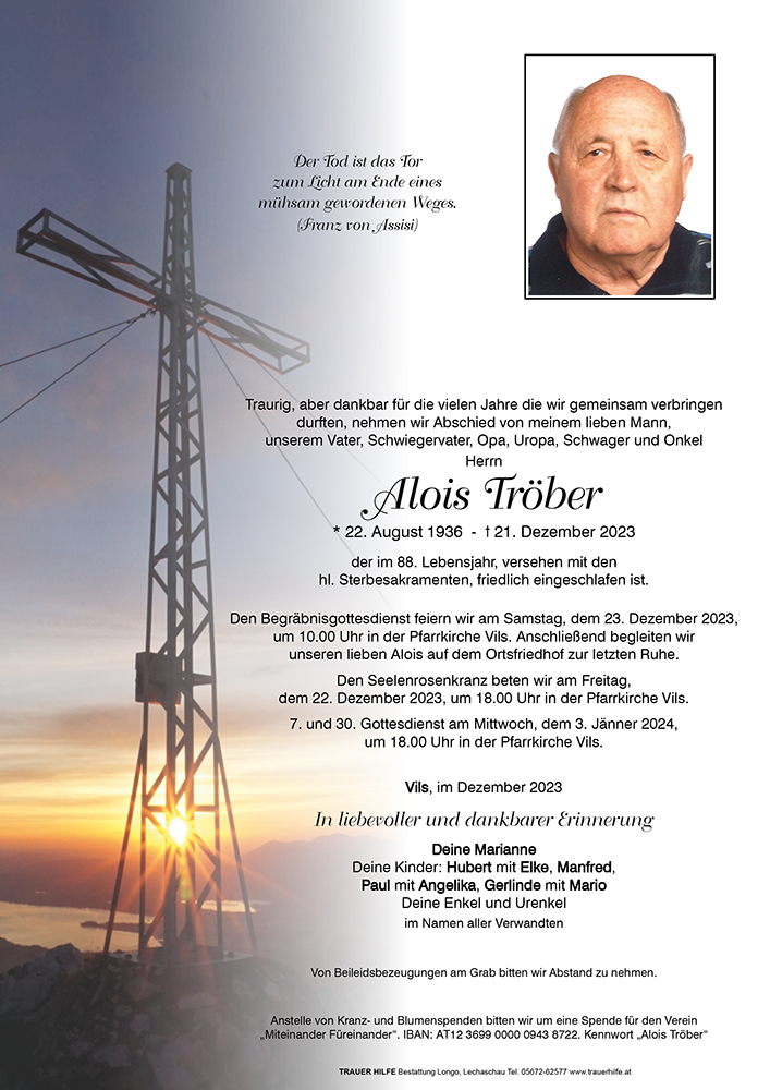 Trauert gemeinsam und erinnert euch an die schönsten Stunden in denen ihr mit Alois zusammen ward, denn in eurer Erinnerungen bleibt ihr Alois verbunden.