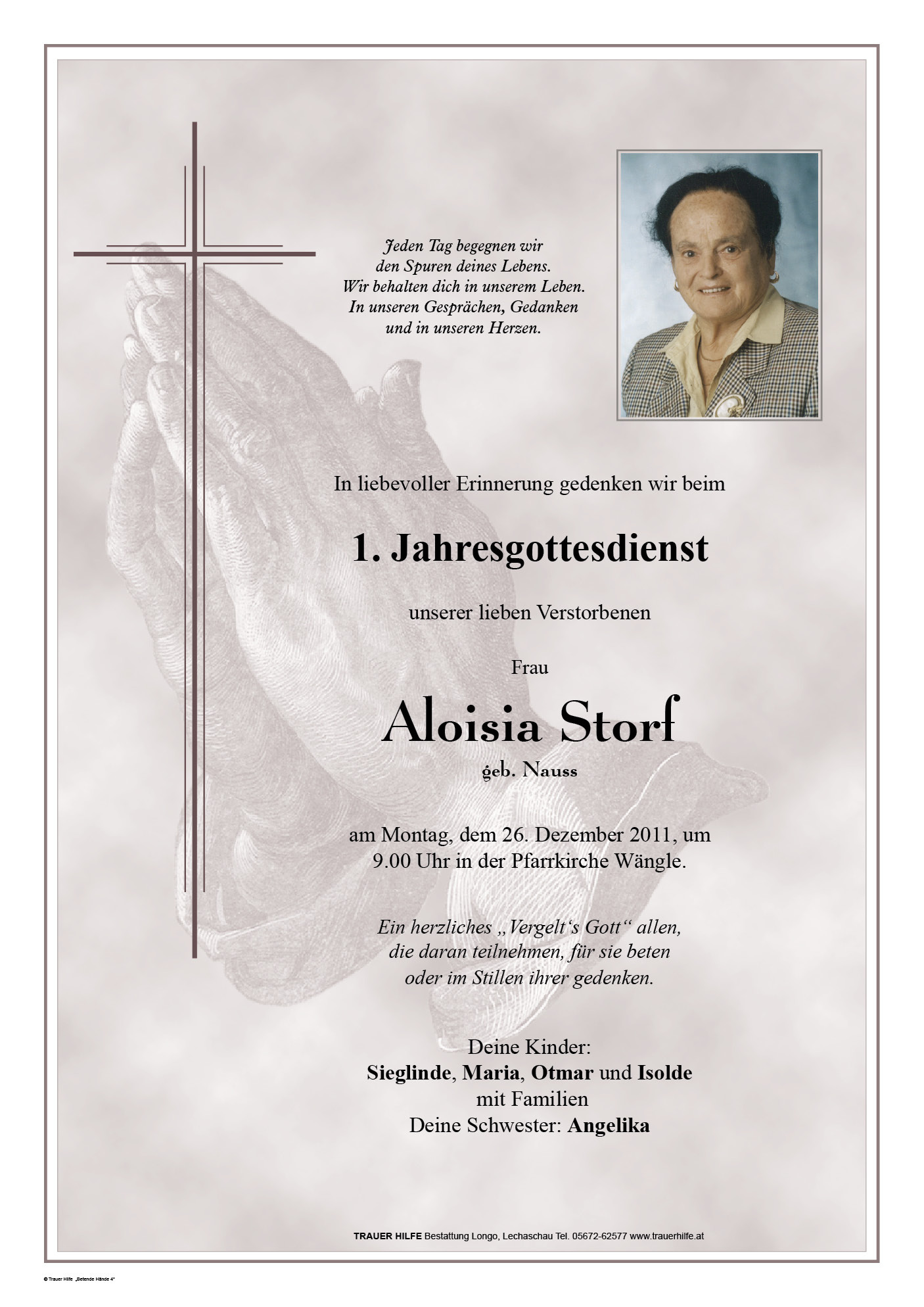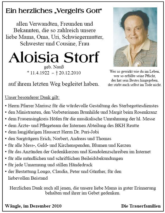 13.12.1901 20.12.2010 Wängle Aloisia Storf Action Parte Sterbebild Gedenkkerzen Kondolenzen Danksagung Jahrestag Parte Sterbebild Gedenkkerzen Kondolenzen Danksagung Jahrestag Parte herunterladen Sterbebild herunterladen Gedenkkerzen für Aloisia Storf 13 Einträge Kerze anzünden Ein Licht für die Ewigkeit! Ein Licht zum Jahrestags-Gedenken Sandra m. Fam. Isolde m. Fam. Sieglinde Deine Familie Annemarie Gerber Hedi Wörle Helmut und Sieglinde Waibel Michaela und Alexandra Sandra, Stefan, Elias u. Lisa Isolde, Klaus u. Nicole Sieglinde Ihre Gedenkkerze fürAloisia Storf Ihr Name* Farbe auswählen Ihre Nachricht oder Name* E-Mail-Adresse* Mit dem Klicken auf "Kerze anzünden" erklären Sie sich mit unseren Datenschutzbestimmungen einverstanden. Kondolenzbuch für Aloisia Storf 0 Einträge Kondolenz verfassen Ihr Abschiedsgruß an Aloisia Storf Ihr Name* E-Mail-Adresse* Ihre Nachricht* Mit dem Klicken auf "Gruß absenden" erklären Sie sich mit unseren Datenschutzbestimmungen einverstanden. Danksagung herunterladen Jahrestag herunterladen