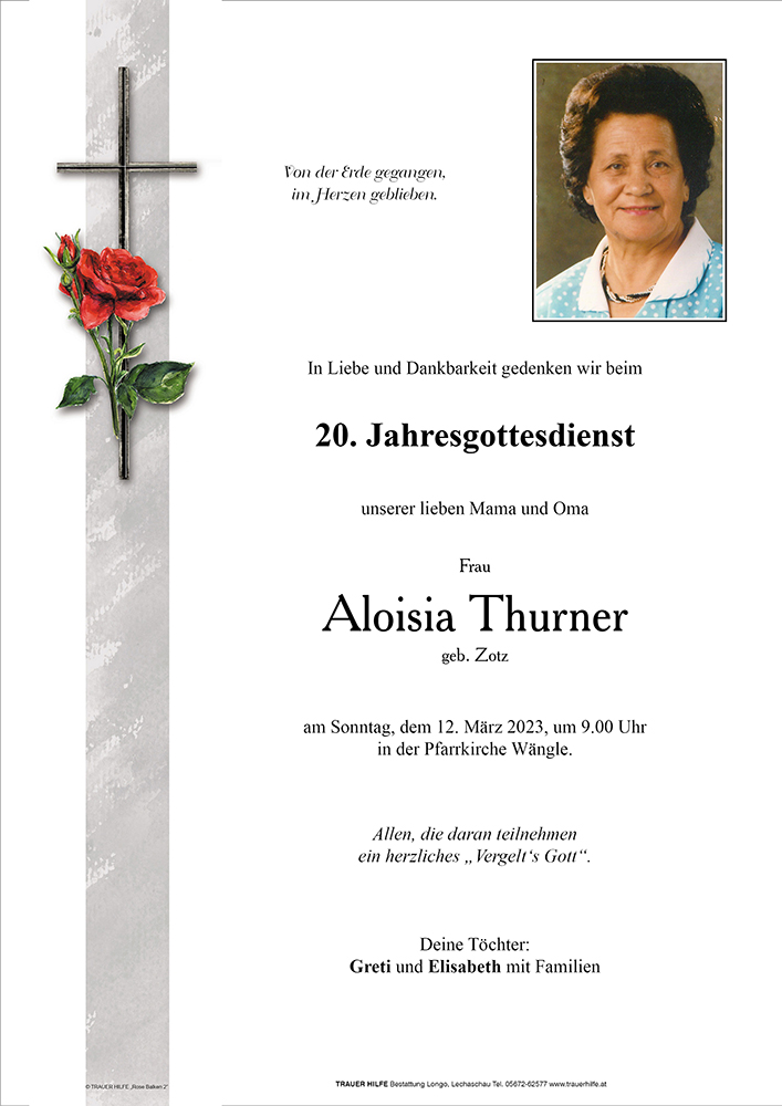 13.12.1901 10.03.2003 Wängle Aloisia Thurner Action Parte Gedenkkerzen Kondolenzen Jahrestag Parte Gedenkkerzen Kondolenzen Jahrestag Parte herunterladen Gedenkkerzen für Aloisia Thurner 1 Eintrag Kerze anzünden Michael und Gitti Ihre Gedenkkerze fürAloisia Thurner Ihr Name* Farbe auswählen Ihre Nachricht oder Name* E-Mail-Adresse* Mit dem Klicken auf "Kerze anzünden" erklären Sie sich mit unseren Datenschutzbestimmungen einverstanden. Kondolenzbuch für Aloisia Thurner 0 Einträge Kondolenz verfassen Ihr Abschiedsgruß an Aloisia Thurner Ihr Name* E-Mail-Adresse* Ihre Nachricht* Mit dem Klicken auf "Gruß absenden" erklären Sie sich mit unseren Datenschutzbestimmungen einverstanden. Jahrestag herunterladen
