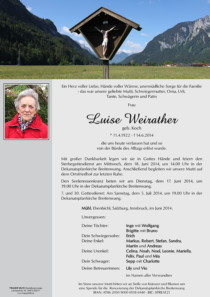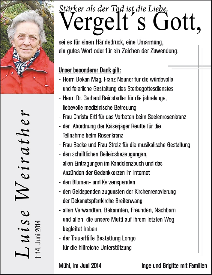 Zum Tode eurer lieben und herzensguten Mama Luisi entbieten wir euch unsere von Herzen kommende, aufrichtige Anteilnahme!
