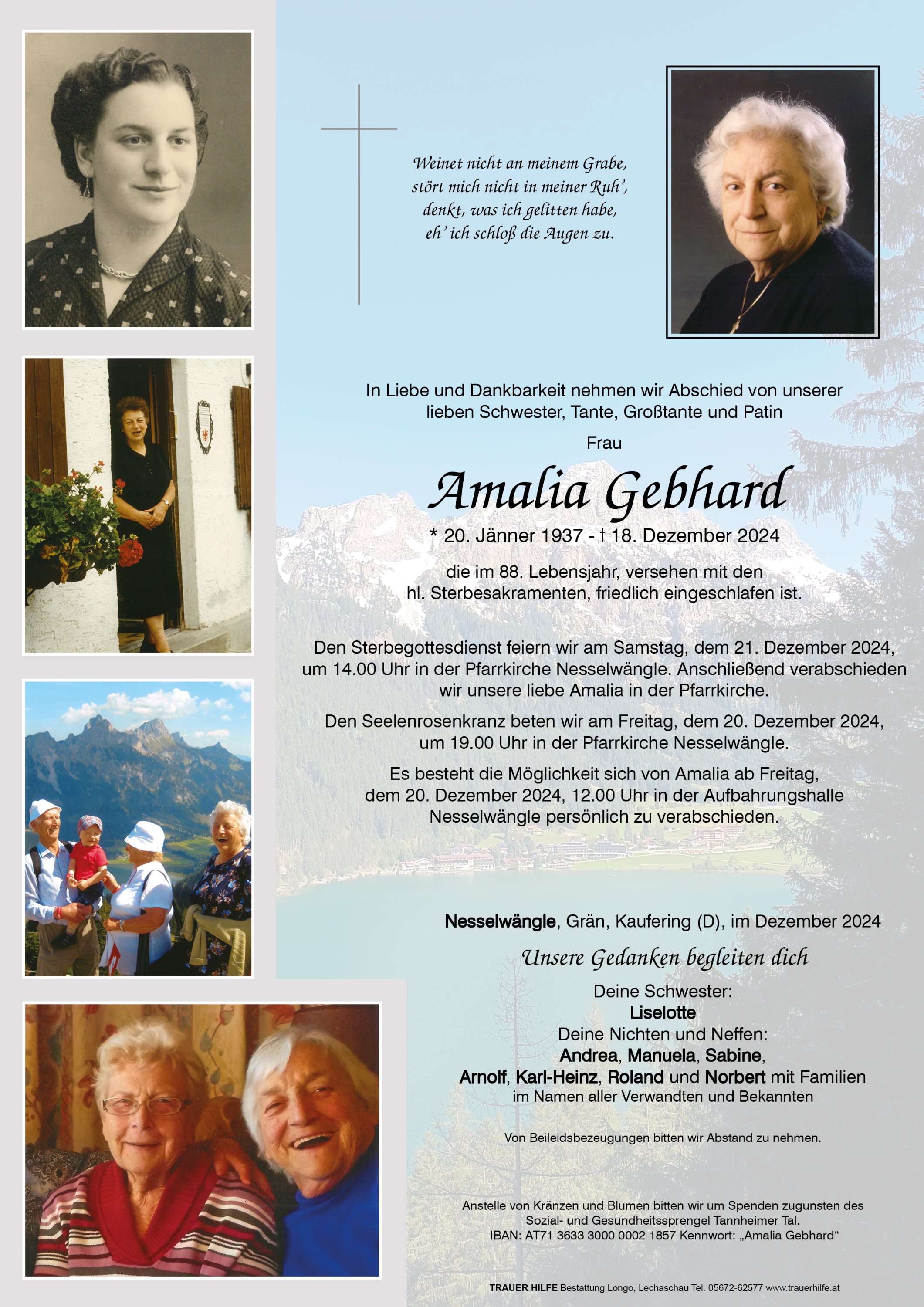 20.01.1937 18.12.2024 Nesselwängle Amalia Gebhard Action Parte Sterbebild Gedenkkerzen Kondolenzen Danksagung Parte Sterbebild Gedenkkerzen Kondolenzen Danksagung Parte herunterladen Sterbebild herunterladen Gedenkkerzen für Amalia Gebhard 168 Einträge Kerze anzünden RIP Manuela & Thomas mit Kindern ?? RIP Manuela & Thomas mit Kindern ?? RIP+ew.Freude Ingrid Posch Wbch. Ruhe in Frieden! ?️ Ein letzter Gruß Norbert Ruth Isenburg Ein letzter Gruß Norbert Ruhe in Frieden! ?️ Sabine und Stefan mit Amelie, David und Livia Ruhe sanft in Gottes Hand - Christine Perle Ein letzter Gruß Norbert RIP Manuela & Thomas mit Kindern ?? Der Friede sei mit dir! Ruth Isenburg Sabine und Stefan mit Amelie, David und Livia Ruhe sanft in Gottes Hand - Christine Perle Christine Pacher Ein letzter Gruß Norbert Ruhe in Frieden! ?️ RIP Manuela & Thomas mit Kindern ?? Zum Geburtstag eine ? Tante Ruhe in Frieden Norbert & Gabi mit Familie Sabine und Stefan mit Amelie, David und Livia Ruhe sanft in Gottes Hand - Christine Perle Christine Pacher Ein letzter Gruß Norbert Zum Geburtstag eine ? Tante Ruhe in Frieden Norbert & Gabi mit Familie Sabine und Stefan mit Amelie, David und Livia Zum Geburtstag eine?liebe Schwester Zum Geburtstag a ?Lichtle in Himmel Ruhe in Frieden! ?️ R.I.P. - Fam. Liane u. Walter Lageder Ruhe sanft in Gottes Hand - Christine Perle Christine Pacher Karin & Helga Ried Ein letzter Gruß Norbert Ruth Isenburg Ruhe in Frieden Norbert & Gabi mit Familie Sabine und Stefan mit Amelie, David und Livia Ruhe in Frieden! ?️ R.I.P. - Fam. Liane u. Walter Lageder Christine Pacher Ruhe sanft in Gottes Hand - Christine Perle Briefträgerin Marlen und Alice Ruhe in Frieden Ein letzter Gruß Norbert In lieber Erinnerung Thomas Klein Ruhe in Frieden Frohe Weihnachten ?✨️?in d. Himmel Ruhe in Frieden - hab\'s fein im Himmel Manuela Elmar Isenburg Margit Ruth Isenburg Wohn- und Pflegeheim Haus Ehrenberg Fam. Marlies und Christian Zobl Gebhard und Julia Mages Grünau ?️? Erika u. Karl Scheiber Ruhe in Frieden Norbert & Gabi mit Familie Emma und Roland Knittel mit Familie Karl und Brunhilde Gundolf Sabine und Stefan mit Amelie, David und Livia Katja Schreieck ? Martina & Christian Barbist Familie.Köhler Heribert und Irene Anita Wibmer ? Barbara Schweißgut ✨️ Kneringer Helmut sen. Ruhe in Frieden Fam. Rosmarie Setari Ruhe in Frieden Ruhe in Frieden Vroni und Heini Fam. Helmut Gebhard Olivia Armin, Daniela und Laura Rief Martha Schatz Hab’s schön im Himmel? Ruhe in Frieden Schneider Monika und Christian Ruhe sanft ? Simone Entstrasser Familie Thomas Wetscher Patricia Ruhe in Frieden Fam. Stefan & Bettina Singer Resi Zotz Maria und Karl Bitesnich Heinrich und Theresia Schneider Max und Evi Wetscher Annemarie und Hans Hosp Fam. Kleiner Xandi und Daniela Familie Helmut Bitesnich RUHE IN FRIEDEN -Johann u. Heidi Durst Carmen Familie Anton Specht Ruhe in Frieden Klaus und Gabi mit Familie Karl-Heinz & Petra mit Peter, Michael + Chris Christine, Mathias u Raffael Wörle Stecher Roman mein Herzliches Beileid Fam.Christian Walter Fam.WITTING Thomas In stillem Gedenken Vroni Zitt Notburga und Franz Perle Riki und Paul Barbist Herzliche Anteilnahme ! Willi & Evi Schmid Ernst Schuster Nicole Guem Wohnbereich EG Erika und Fritz Wolf Julia Hundertpfund Jana Außerladscheider Fam. Gerda & Richard Posch Hubert Mark Conni & Martin Fam. Bettina u. Stefan Giehl Birgit mit Fam.Witting ? Andrea u. Roland Pirschner-Wötzer RIP Ruhe in Frieden! Brigitte & Othmar Babl Joachim Birgit Beyrer Karoline Guem mit Beatrix und Christian Elisabeth und Albina Singer Thomas und Renate Maringele Ruhe in Frieden Hab’s schön im Himmel? Ruhe in Frieden, Greti Scheiber mit Familie Ruhe in Frieden! ?️ Monika Bilgeri Ulli Zitt Christine Pacher Ruhe in Frieden Amalia. Sigrid Wolf Fam. Karin & Patrick Babl Petra und Günther Schädle Das Team der Pflegeberatung vom BKH Reutte Bernd u.Tanja m.Kinder??? Hanspeter und Inge Posch Bernd & Elfi Rief Thomas Frick Schatz Agathe Fam. Harald &Barbara Schatz R.I.P. - Fam. Liane u. Walter Lageder Birgit Rief Familie Kneringer Evelyn und Helmut Erika Bilgeri Reinhard und Inge Strigl Margit und Paul Meier Ruhe in Frieden Magdalena und Eduard Friede und Freude werde dir zuteil Resi Zotz RIP David, Jasmin, Pascal & Isabella Adrian und Annelies Otto und Zita Mario und.Barbara Rief Julia Gruber Paul und Traudel Bilgeri Elmar Isenburg Elias und Samuel Rief RIP Manuela & Thomas mit Kindern ?? Ruth Isenburg Liselotte & Arnolf Brunhilde und Hannes Ruhe sanft in Gottes Hand - Christine Perle Gebhard und Heidi Linde Schatz Ruhe in Frieden Amalia, Martina Singer Sabine u. Christian Alber mit Familie Claudia Schreieck TrauerHilfe Bestattung Longo Ihre Gedenkkerze fürAmalia Gebhard Ihr Name* Farbe auswählen Ihre Nachricht oder Name* E-Mail-Adresse* Mit dem Klicken auf "Kerze anzünden" erklären Sie sich mit unseren Datenschutzbestimmungen einverstanden. Kondolenzbuch für Amalia Gebhard 0 Einträge Kondolenz verfassen Ihr Abschiedsgruß an Amalia Gebhard Ihr Name* E-Mail-Adresse* Ihre Nachricht* Mit dem Klicken auf "Gruß absenden" erklären Sie sich mit unseren Datenschutzbestimmungen einverstanden. Danksagung herunterladen