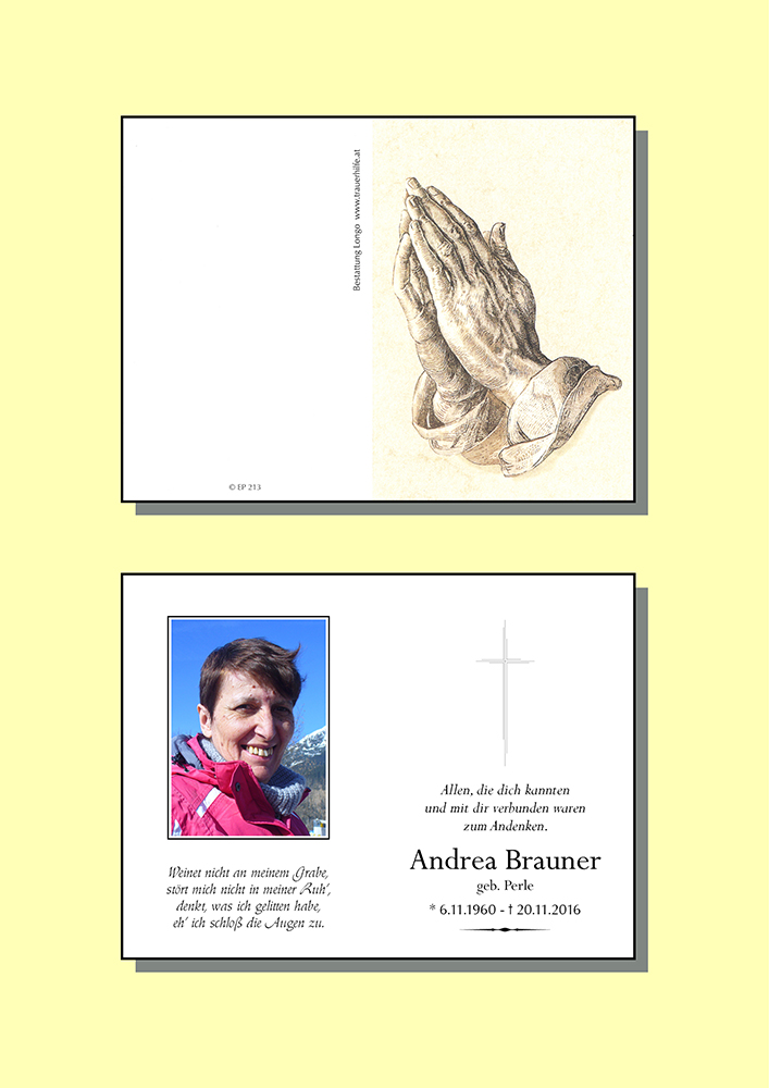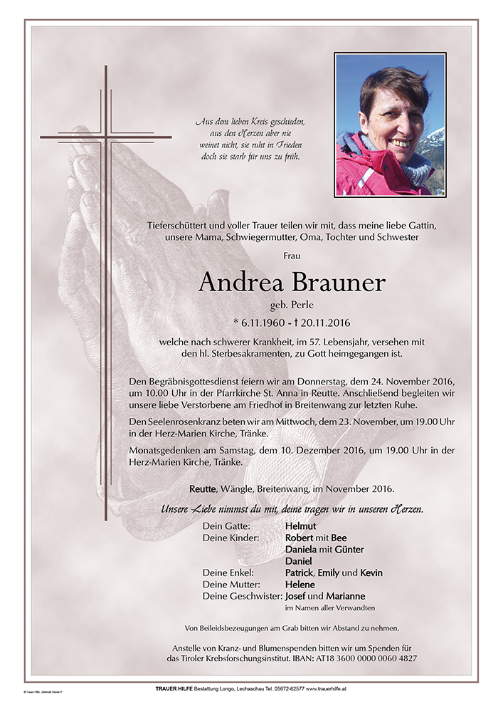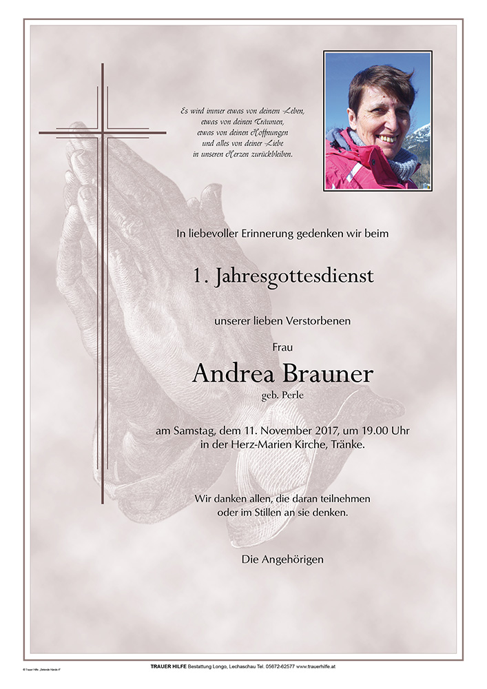 Andrea musste sehr früh durch das Tor schreiten, das euch noch verschlossen bleibt. Wenn ihr einen Weg sucht, sie zu treffen, sucht sie nicht weinend am Tor. Geht ein Stück eures Weges und sucht sie voll Hoffnung und lauschend im zwitschern der Vögel, im rascheln des Laubes, im wehen des Windes und horcht wie ein Wasserlauf zu euch spricht auf dem Weg in die Zukunft.