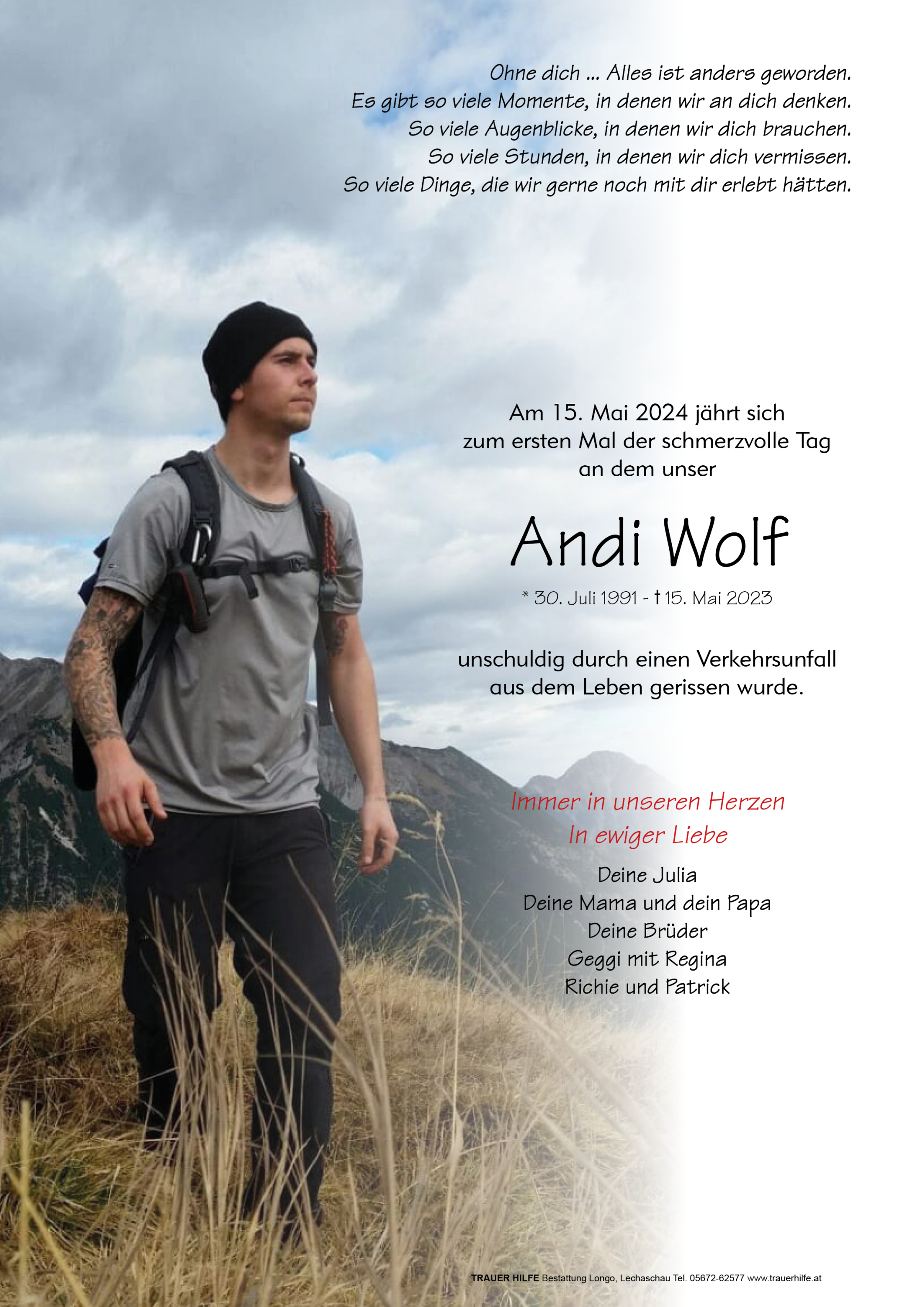 der tragische Unfalltod von eurem Andi hat mich zutiefst erschüttert. Ich wünsche euch meine aufrichtige Anteilnahme und hoffe, dass euch die Liebe und Unterstützung von Familie und lieben Freunden in dieser schweren Zeit wieder Zuversicht und Hoffnung auf ein Leben mit diesem Schicksalsschlag bieten. Mein aufrichtiges Beileid, Kathleen