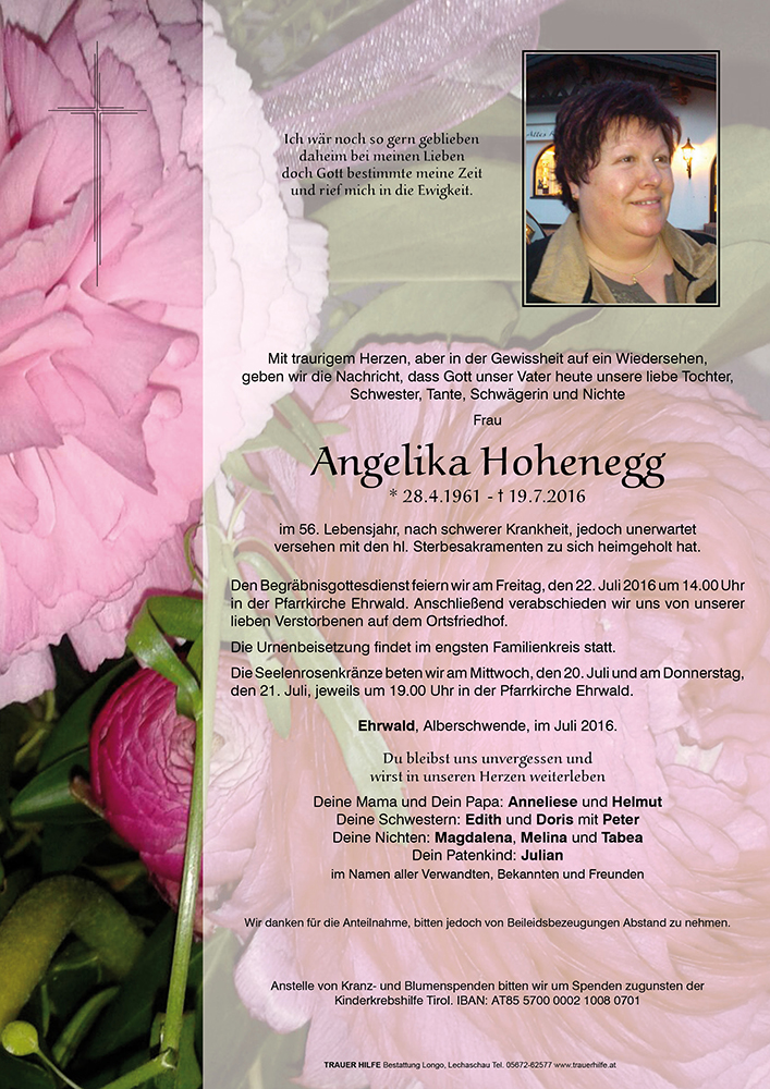Angelika ist uns den Weg voraus gegangen, den wir einmal alle betreten werden. Wir wünschen Euch, dass die Erinnerungen an schöne gemeinsame Stunden den Schmerz der Trennung überwinden lassen. Viel Kraft für die kommenden Tage, auch wir werden Angelika nicht vergessen.