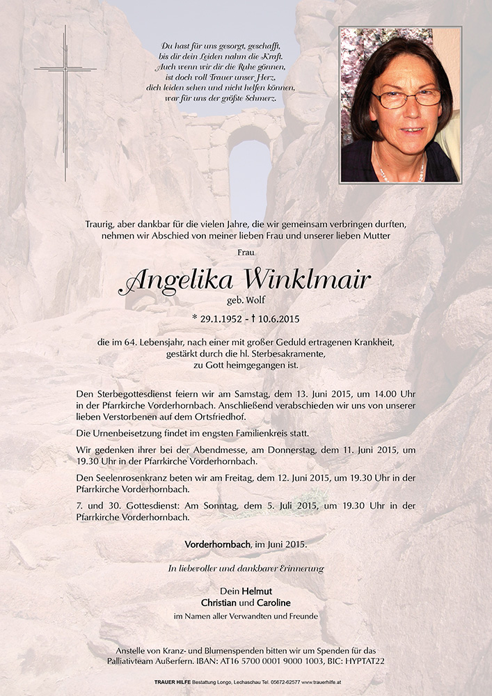Nach langem Leiden hat der liebe Gott Angelika erlöst. Wir sind in Gedanken bei euch Charlotte und Erich