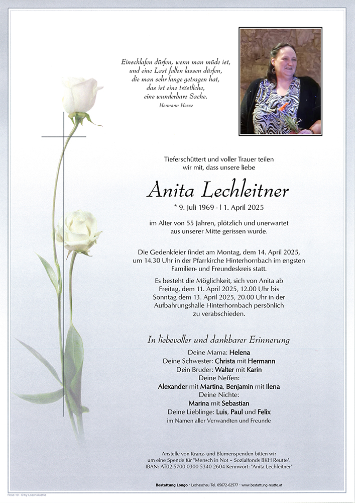 Mit diesem Gedanke der Verwandlung in eine andere Zukunft wünsche ich euch Angehörigen viel Kraft auf den letzten Wegen mit Anita.