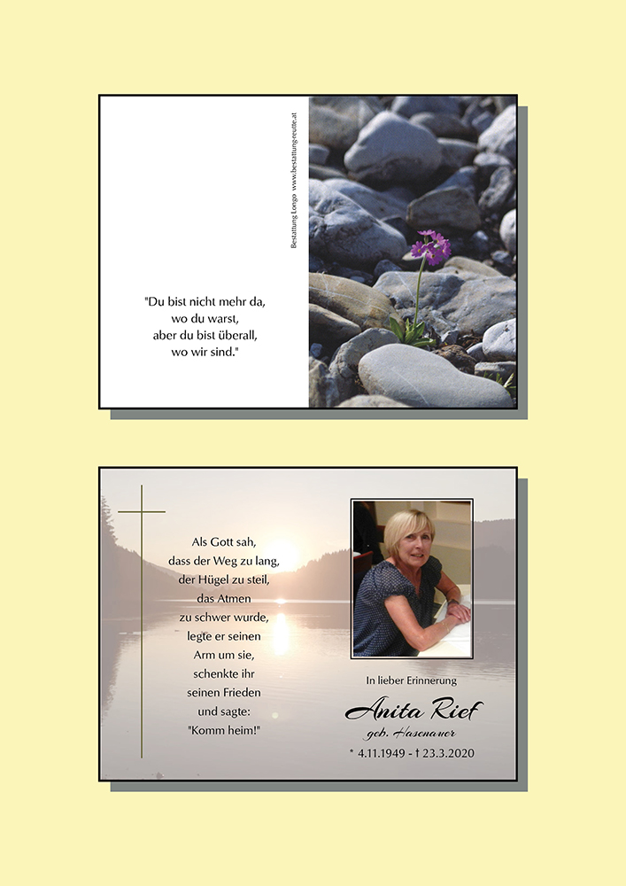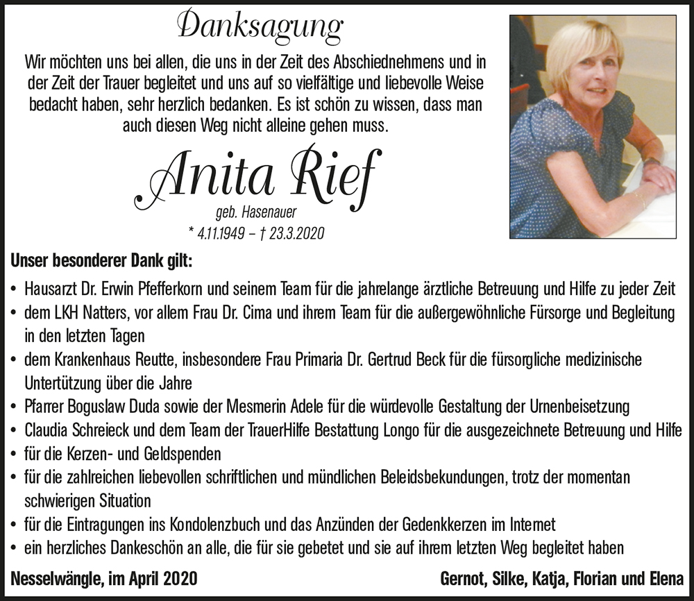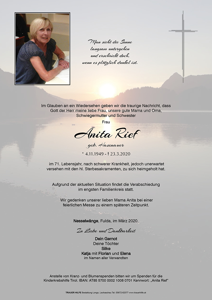 Grundlage unseres christlichen Glaubens ist die Hoffnung auf ein Wiedersehen in der Ewigkeit. Dies möge auch Euch Trost und Stärkung sein. Anita hat viele Spuren der Liebe und Fürsorge hinterlassen und die Erinnerung an all das Schöne wird mit ihr lebendig sein.