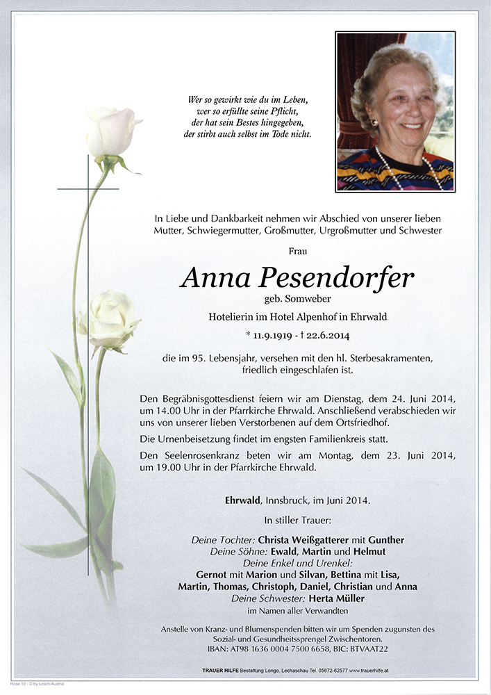 eben habe ich vom Ableben von Frau Anna Pesendorfer erfahren. Die Nachricht macht mich sehr betroffen und ich möchte Euch mein Mitgefühl aussprechen.