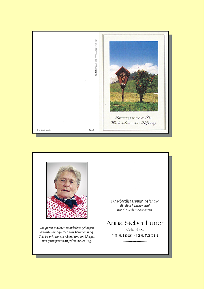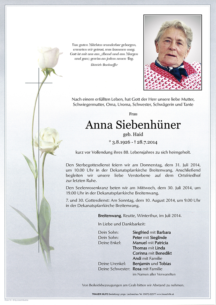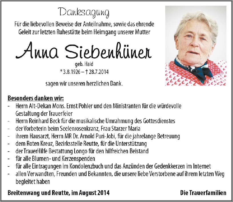 Zum Tode eurer Mutter Anna möchte ich euch meine aufrichtige Anteilnahme und mein Beileid aussprechen. Die vielen Stunden bei euch daheim bleiben unvergesslich.