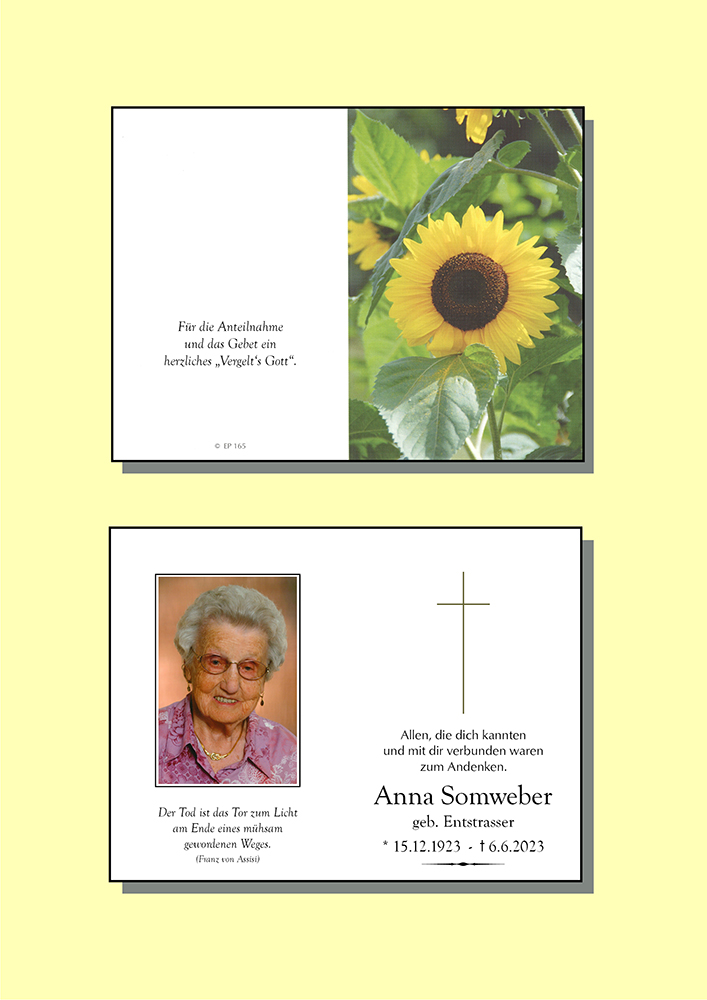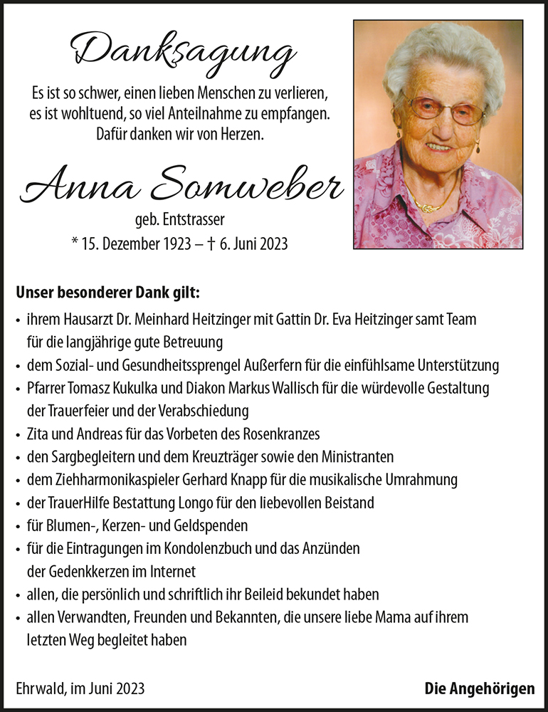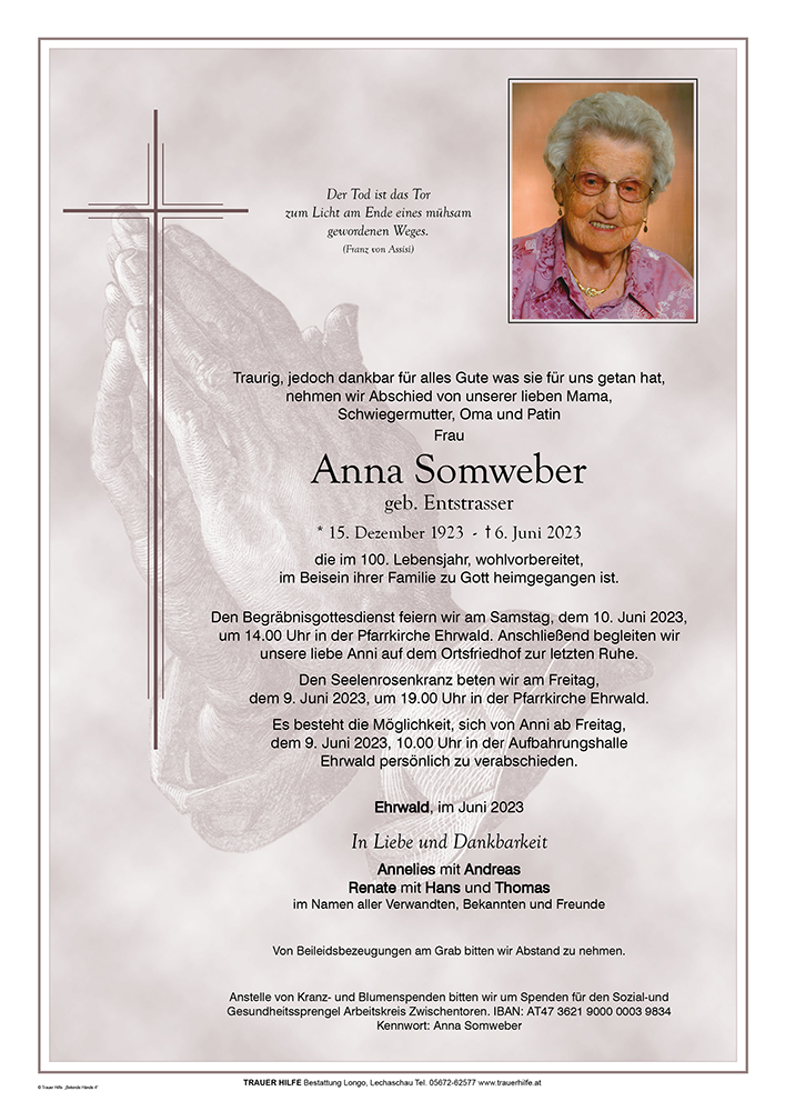 Ein langes, erfülltes Leben ging zu Ende. Der Tod von Anna macht auch uns traurig. Was uns in Erinnerung bleibt, ist ihre stets freundliche, offene, hilfsbereite und humorvolle Art, Menschen zu begegnen.