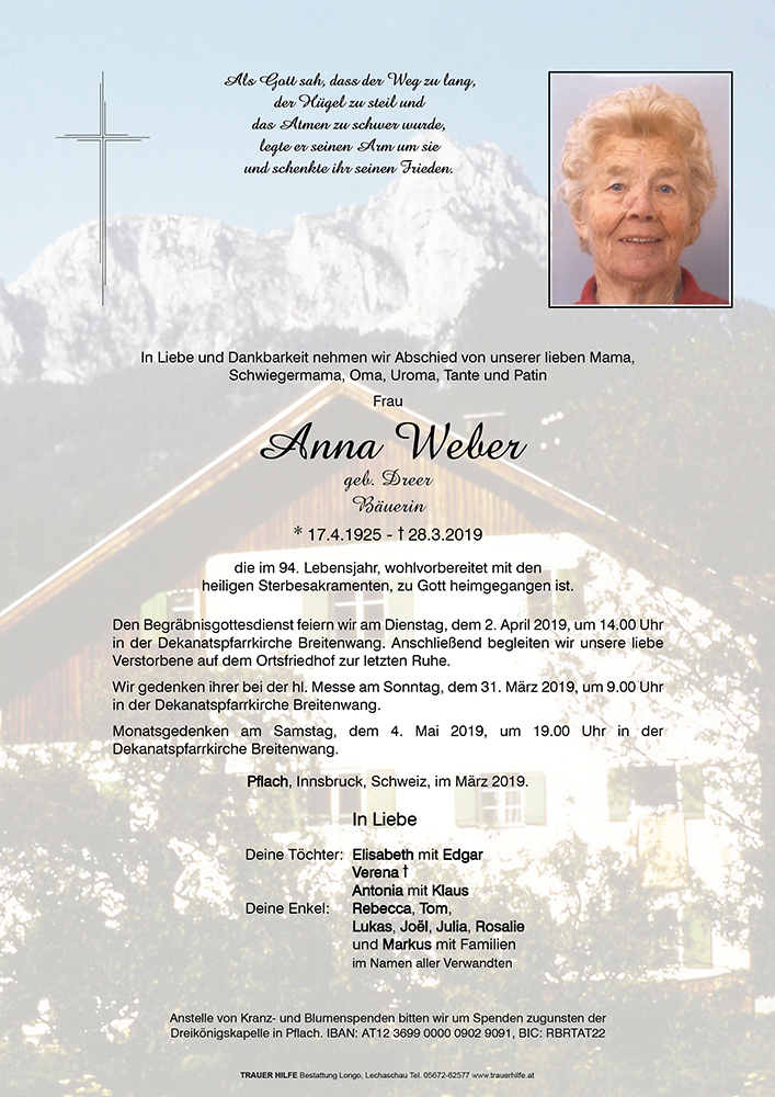Liebe Antonia, werte Trauerfamilie, zum Tod eurer Lieben Mama möchten wir euch unser herzliches Beileid aussprechen. Wir haben eure Mama sehr geschätzt, sie durfte ein hohes Alter erreichen. Im Mitgefühl verbunden herzlich Reinhilde und Karl