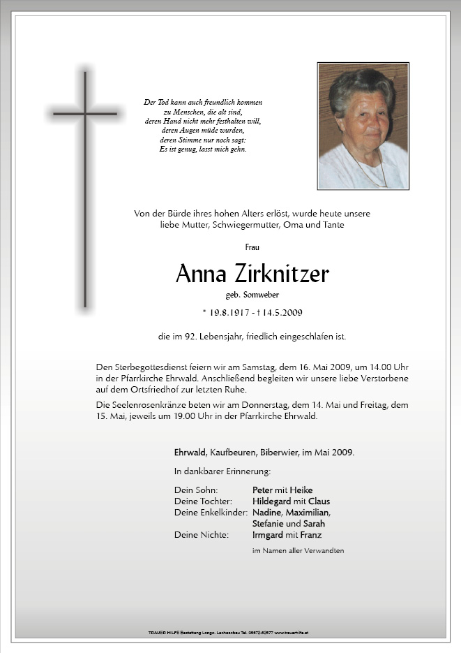 13.12.1901 14.05.2009 Ehrwald Anna Zirknitzer Action Parte Gedenkkerzen Kondolenzen Parte Gedenkkerzen Kondolenzen Parte herunterladen Gedenkkerzen für Anna Zirknitzer 5 Einträge Kerze anzünden Weihnachtslicht und Neujahrslicht für dich Neujahrskerze für dich, aus Lermoos Ruhe in Frieden Weihnachtslicht für dich Osterkerze Ihre Gedenkkerze fürAnna Zirknitzer Ihr Name* Farbe auswählen Ihre Nachricht oder Name* E-Mail-Adresse* Mit dem Klicken auf "Kerze anzünden" erklären Sie sich mit unseren Datenschutzbestimmungen einverstanden. Kondolenzbuch für Anna Zirknitzer 0 Einträge Kondolenz verfassen Ihr Abschiedsgruß an Anna Zirknitzer Ihr Name* E-Mail-Adresse* Ihre Nachricht* Mit dem Klicken auf "Gruß absenden" erklären Sie sich mit unseren Datenschutzbestimmungen einverstanden.