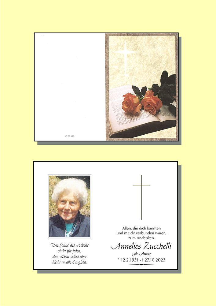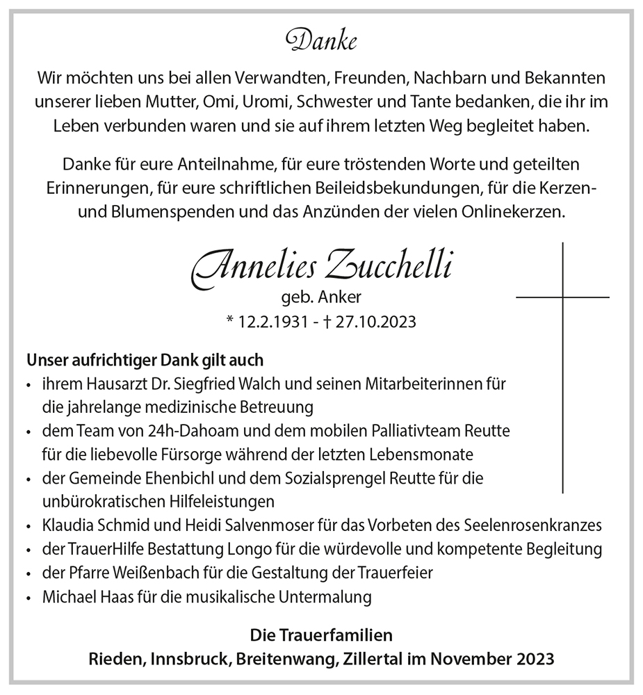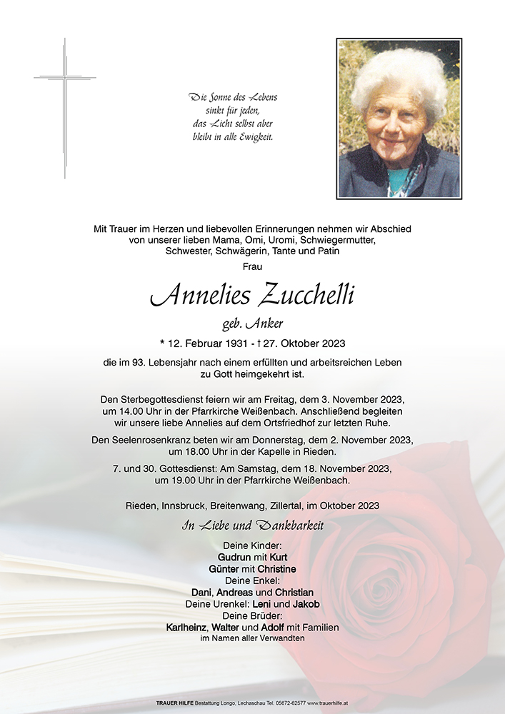 Leb\' wohl Annelies! Danke, dass wir Dich auf Deinem Weg begleiten durften. Du wirst mit Freude und Liebe von Gottes ausgestreckten Armen empfangen werden.