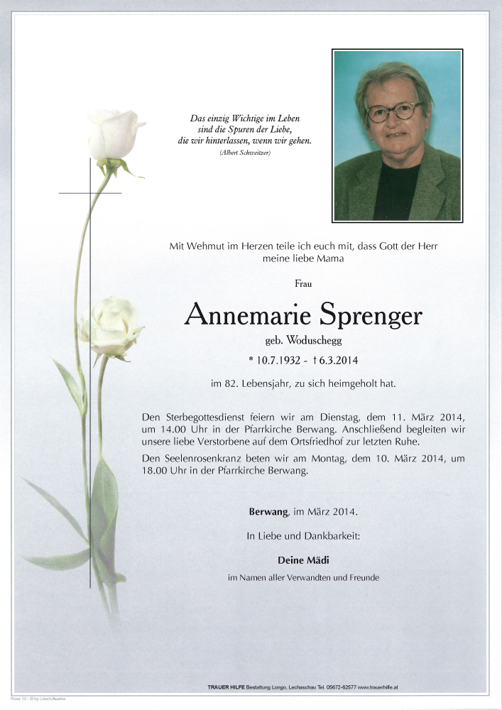Kondolenzbuch für Annemarie Sprenger