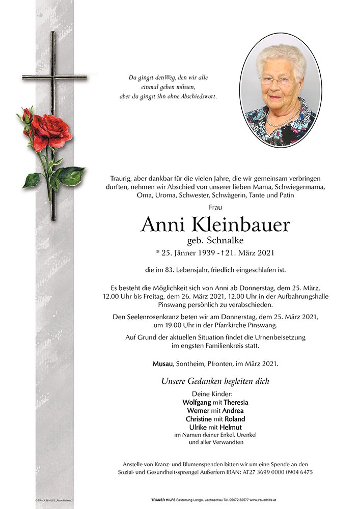 Anni wird uns fehlen,in unserer Gemeinschaft,aber vor allem wird sie euch fehlen,an der Seite des Alltags. Aufrichtige Anteilnahme