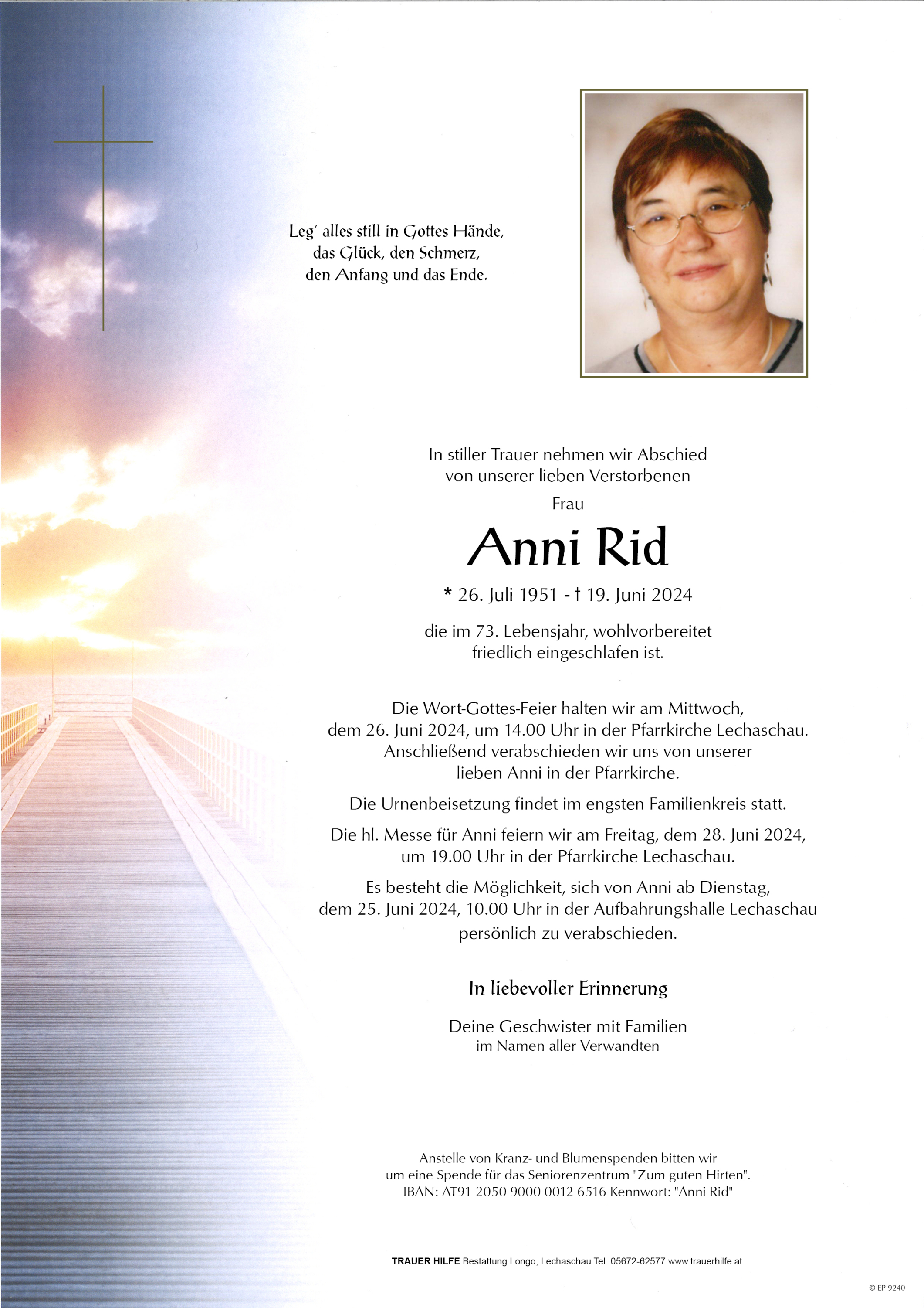 Wir wünschen Anni alles Gute auf ihrer letzten Reise so gerne ist sie mit uns Pensionisten mitgefahren , wir wünschen den Hinterbliebenden Trost und Kraft das entbietet euch von Herzen der Pensionisten Verband aus Lechaschau Kassierin Pellegrini Maria mit Vorstand !