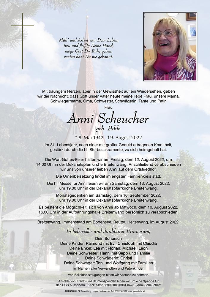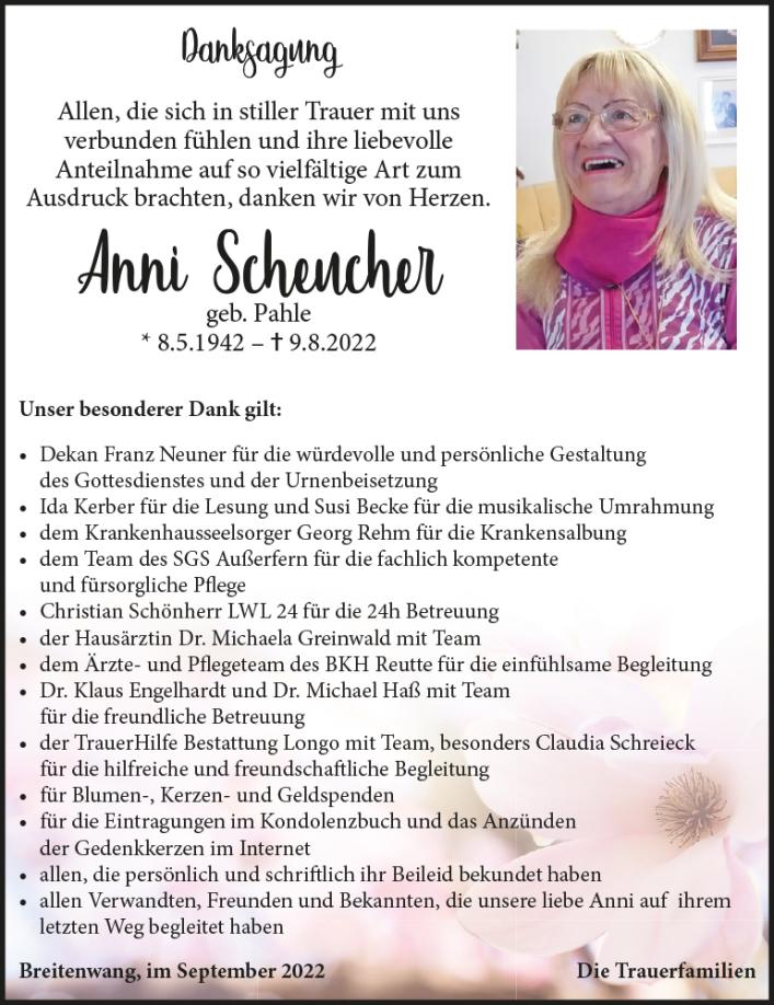 Zum Heimgang von Anni möchten wir unser aufrichtiges Beileid und unser Mitgefühkl ausdrücken. Viele Jahre hat Anni mit großer Geduld, tapfer ihre Krankheit ertragen.