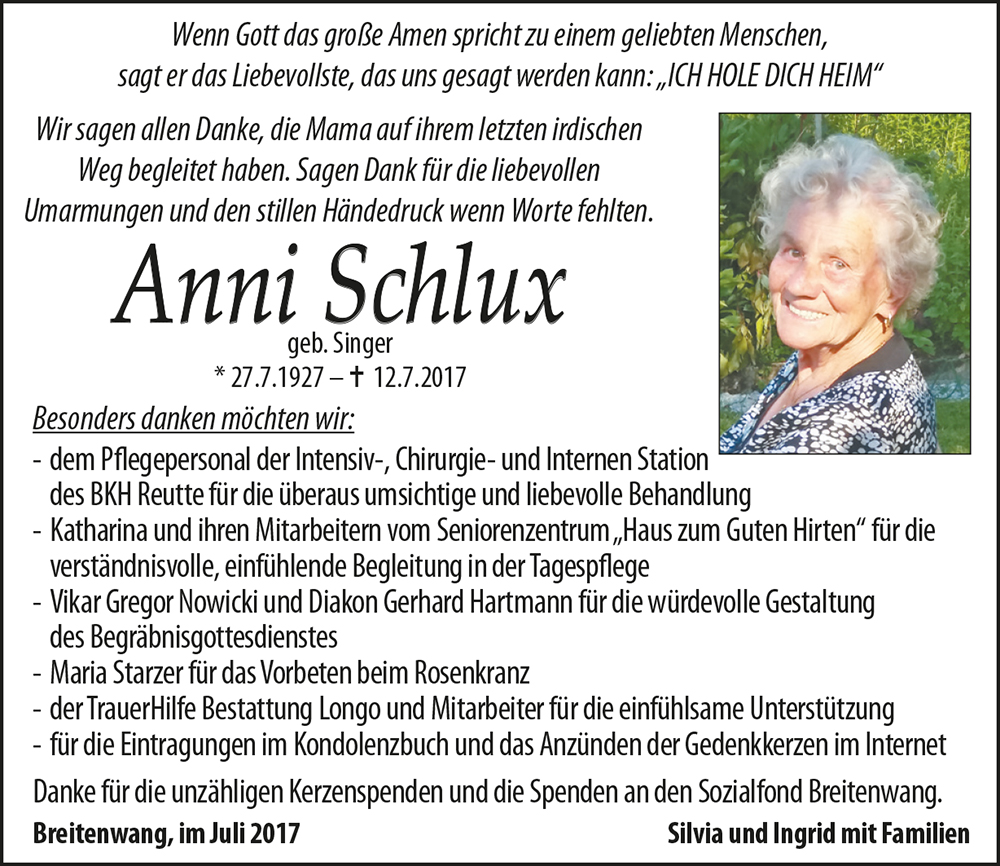 Zum Tode eurer lieben und guten Mama Anni entbieten wir euch unsere von Herzen kommende Anteilnahme!