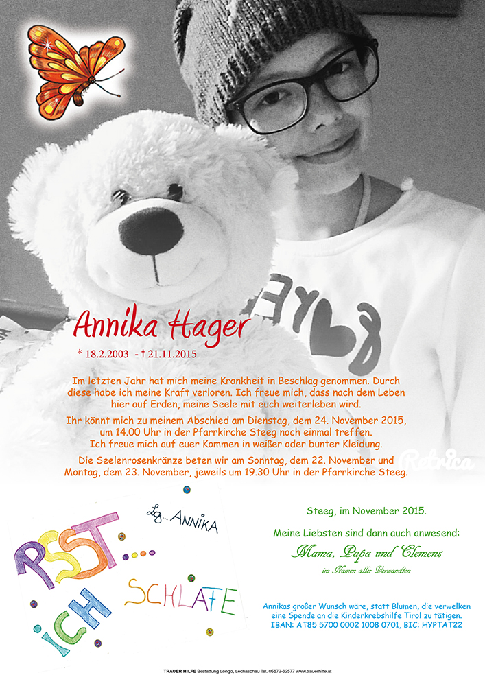 Liebe Annika, ich weiß nicht warum, aber ich habe letzte Nacht wieder einmal an dich denken müssen, und habe dann erst heute morgen die traurige Nachricht gelesen...ich bin sehr traurig darüber...ich behalte die schönen Erinnerungen an dich im Herzen und bete für dich und deine Familie...liebe Susanne, lieber Helmut und Clemens...wir denken jeden Tag an jene die es nicht so leicht haben oder bereits den Kampf verloren haben...unser aufrichtiges Beileid! Sarah mit Manuel, Raphael und Noah aus Südtirol