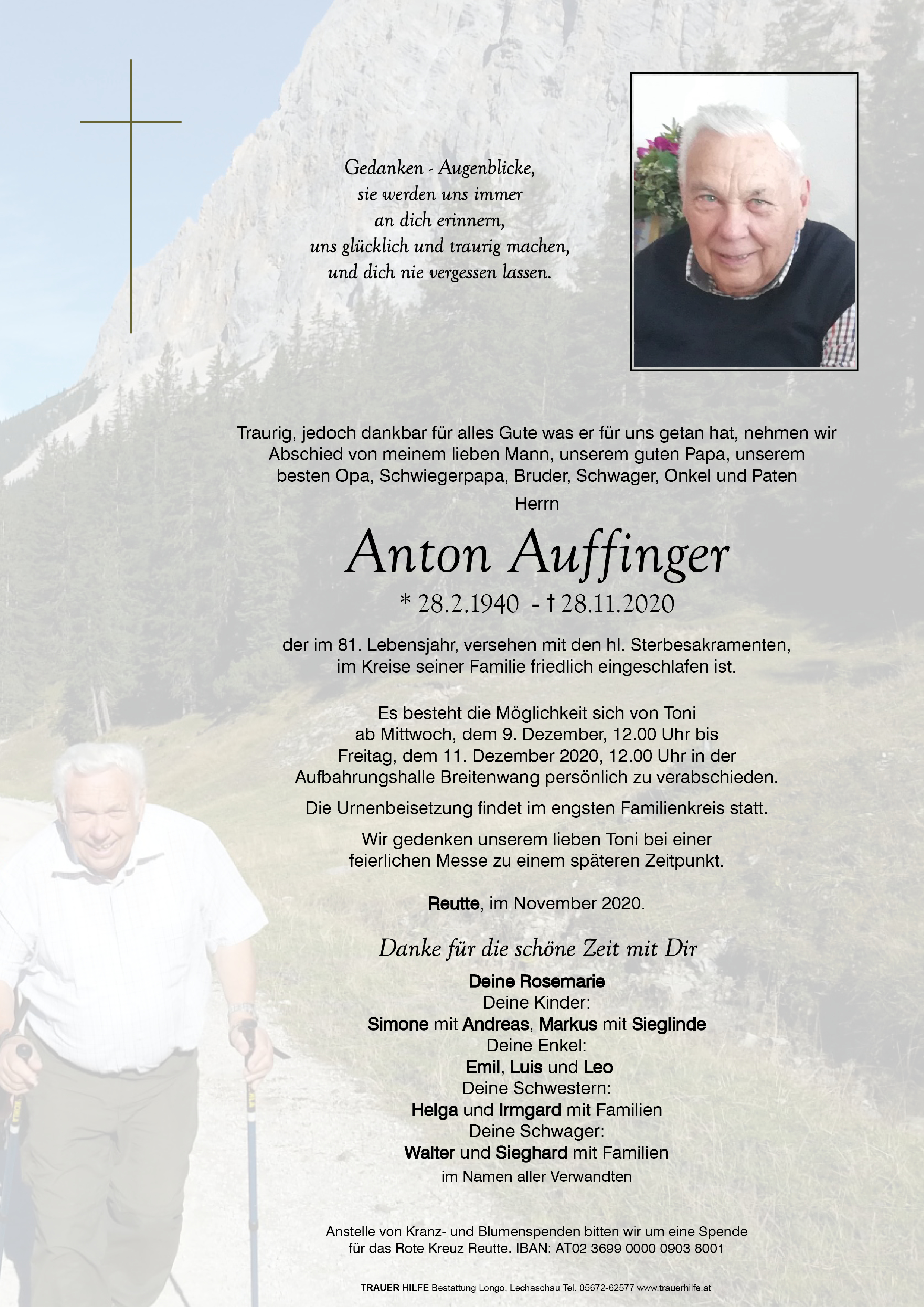 Liebe Rosmarie, werte Trauerfamilie, der Eures lieben Toni macht uns betroffen und traurig. In herzlichem Mitgefühl mit Euch verbunden, Karl und Reinhilde