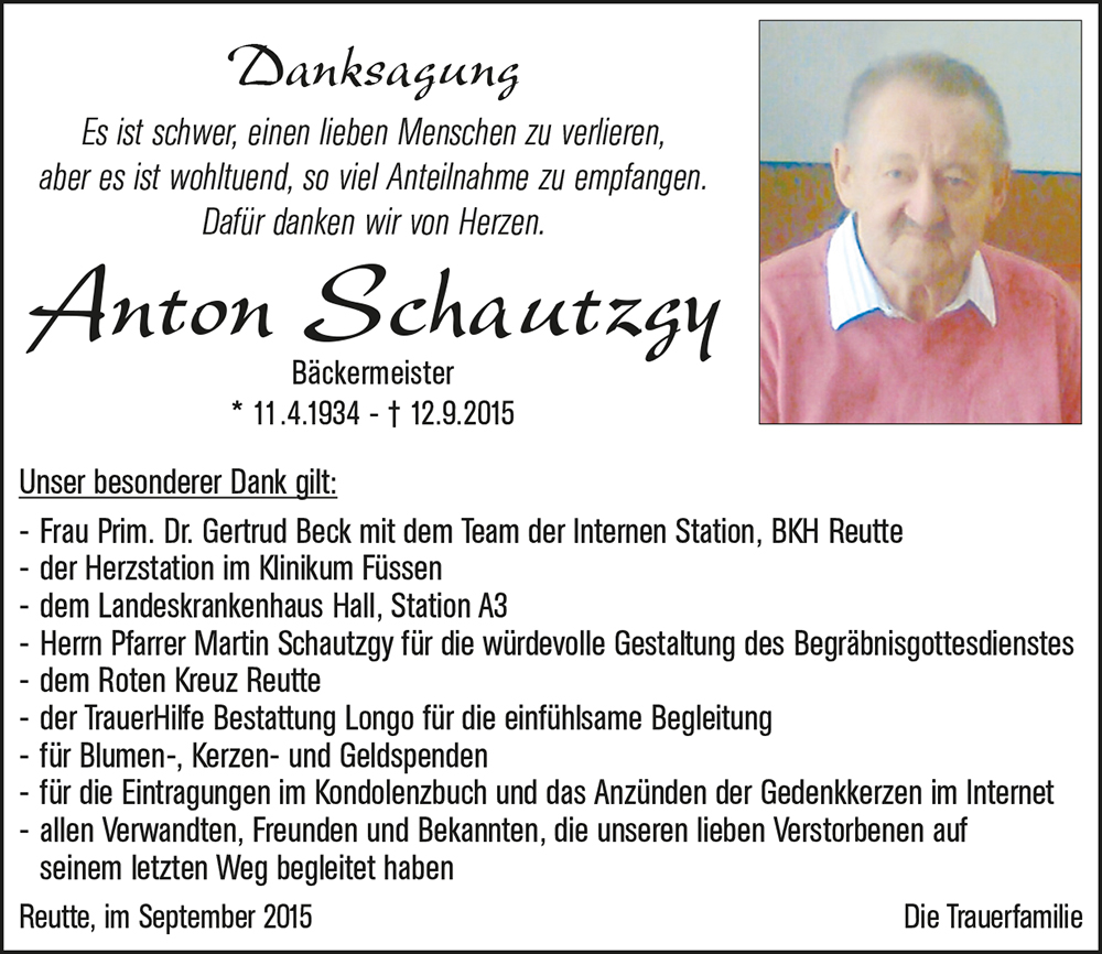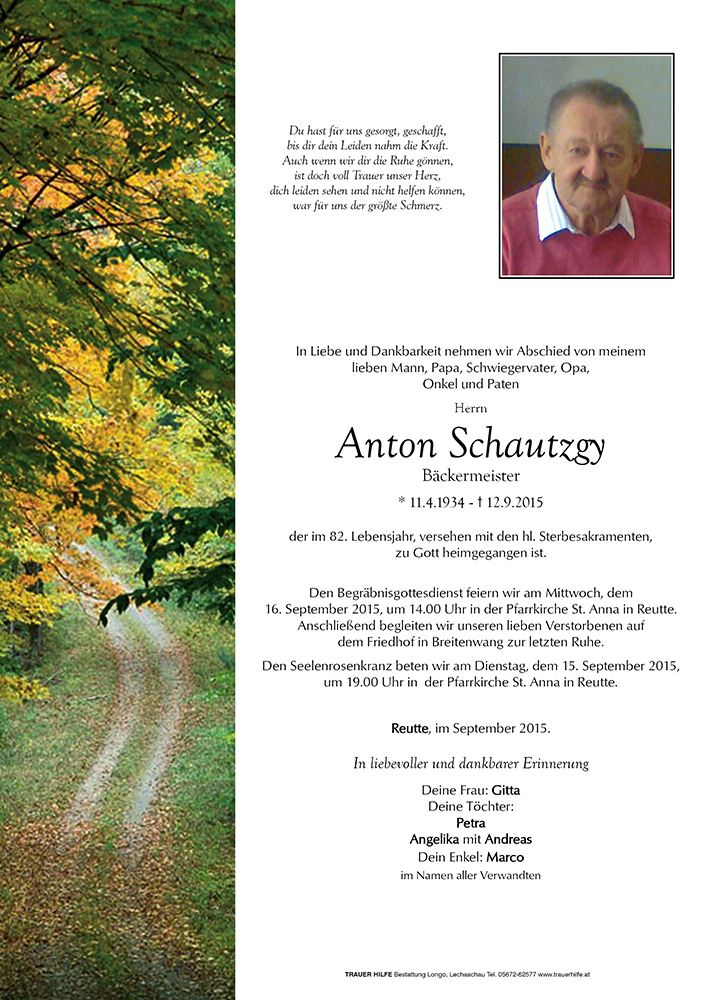 unvergesslich wird mir "Toni" in Erinnerung bleiben, wie er täglich in unserem Geschäft das bis heute unvergleichbare "Schautzgy-Brot" angeliefert hat - freundlich, gut gelaunt und vor allem immer einen Witz oder Schmäh "im Korb" mitführte. Reutte verliert leider einen großen Meister seines Faches, und Ihr, liebe Trauerfamilie wohl einen sehr liebenswerten Menschen. Entbiete euch meine aufrichtige Anteilnahme.