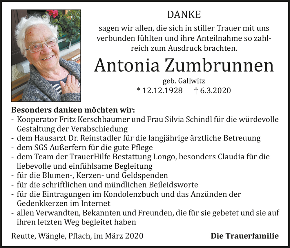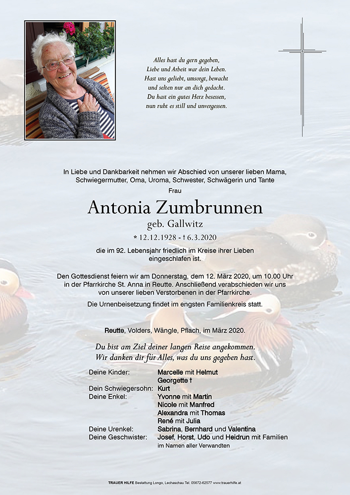 Antonia hat mit ihrem Humor und ihrer Fröhlichkeit über Jahrzehnte hindurch tausende Menschen im Außerfern zum Lachen gebracht, damit fröhlich gemacht und zumindest für Stunden, Tage, Wochen ihre Alltagssorgen und Krankheiten vergessen lasse. Sie war stets hilfsbereit und hat viele tausende Stunden unbezahlt für ihre Mitmenschen eingesetzt. Ihre Fröhlichkeit hat einen unvergesslichen Platz in unseren Herzen.