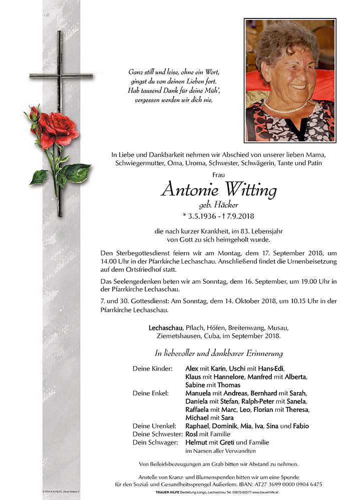 Mein aufrichtiges Beileid zum Ableben eurer Mutter und Oma. Ich wünsche euch viel Kraft in dieser schweren Zeit.