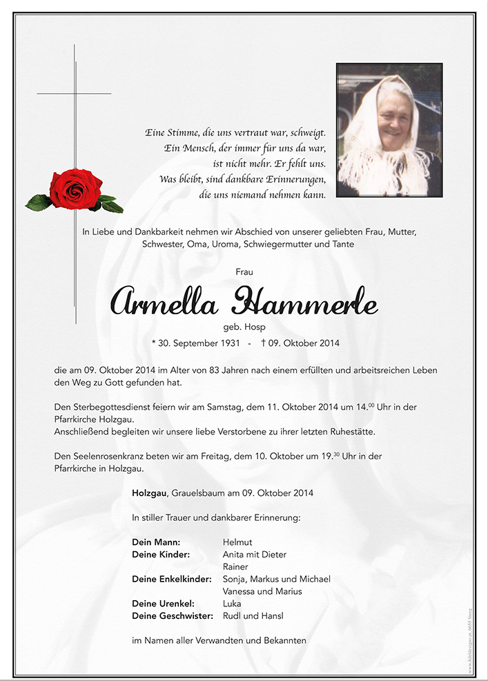 Eure Mama und Oma hat ihre letzte große Reise angetreten. Wir entbieten unsere aufrichtige Anteilnahme und wünschen euch, dass auf die Zeit der Leere und Trauer eine Zeit der dankbaren Erinnerung folgt.